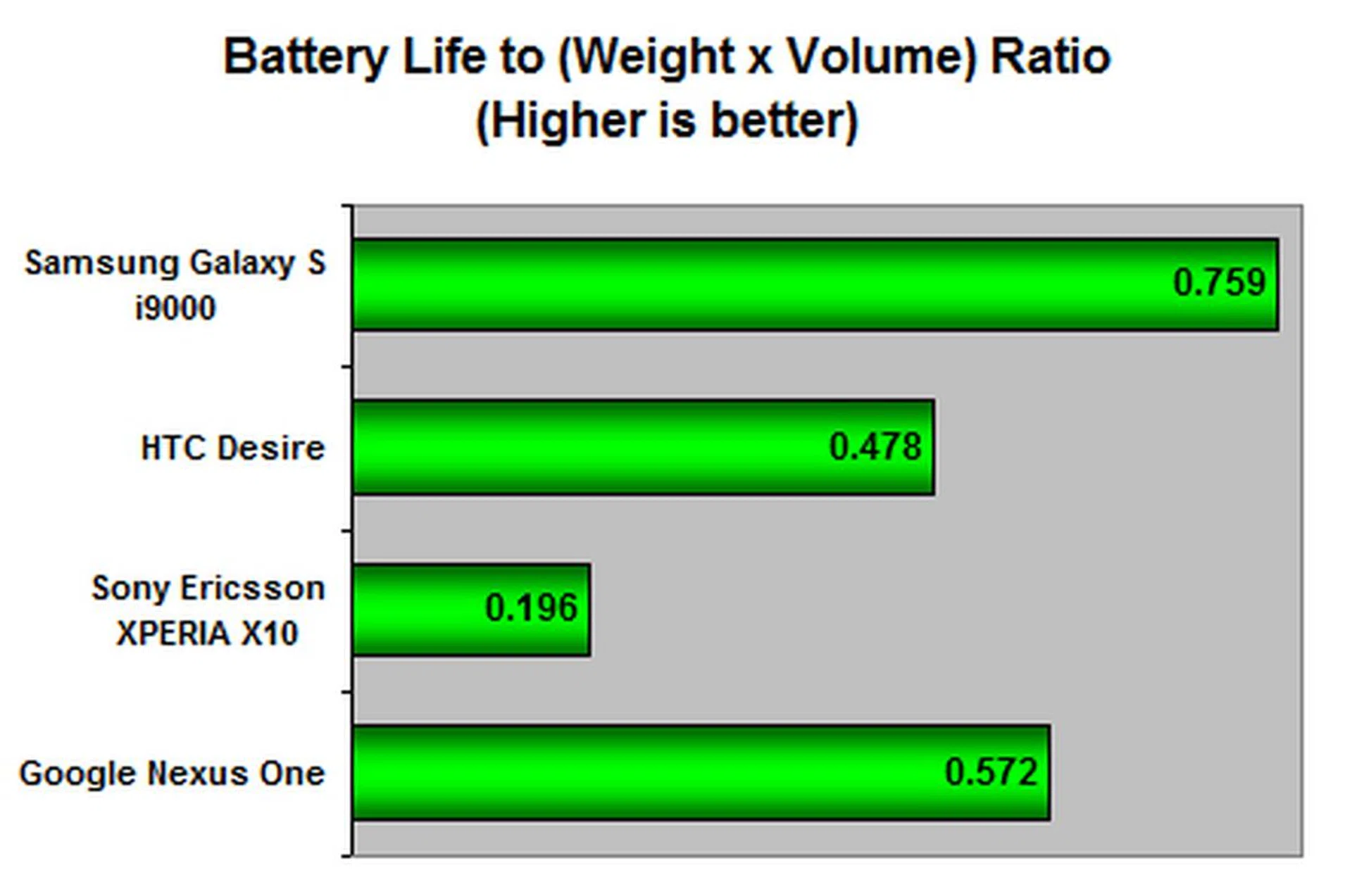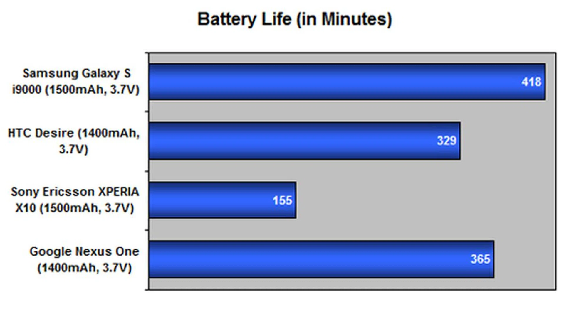 In our customary battery life test, we play back in a continuous loop a test video encoded at 240 x 320 resolution under the following conditions: 100% screen brightness and volume and Wi-Fi and Bluetooth active, with push email or data being pulled from the network at regular intervals. The Samsung Galaxy S i9000 goes up against the HTC Desire, Google Nexus One, Motorola Milestone and Sony Ericsson XPERIA X10.