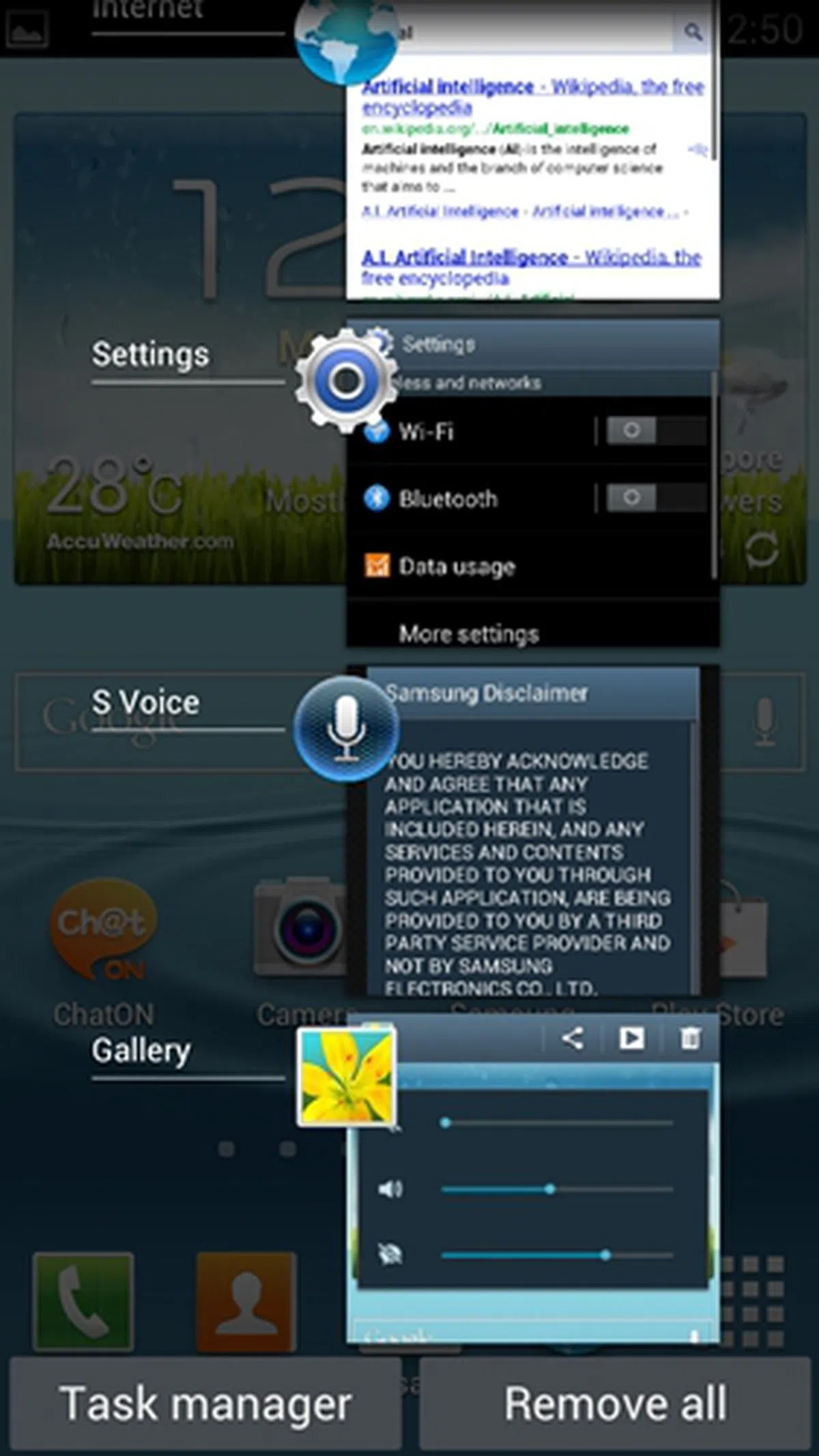 You don't get a one-click button to the multi-tasking launcher like you do on the Galaxy Nexus or the HTC One X due to its button configuration. Instead, you have to press and hold the home button to access that. However, you can easily remove all apps or navigate to the Task Manager with one click of a button - both of which are not available on the Nexus and One X. | |