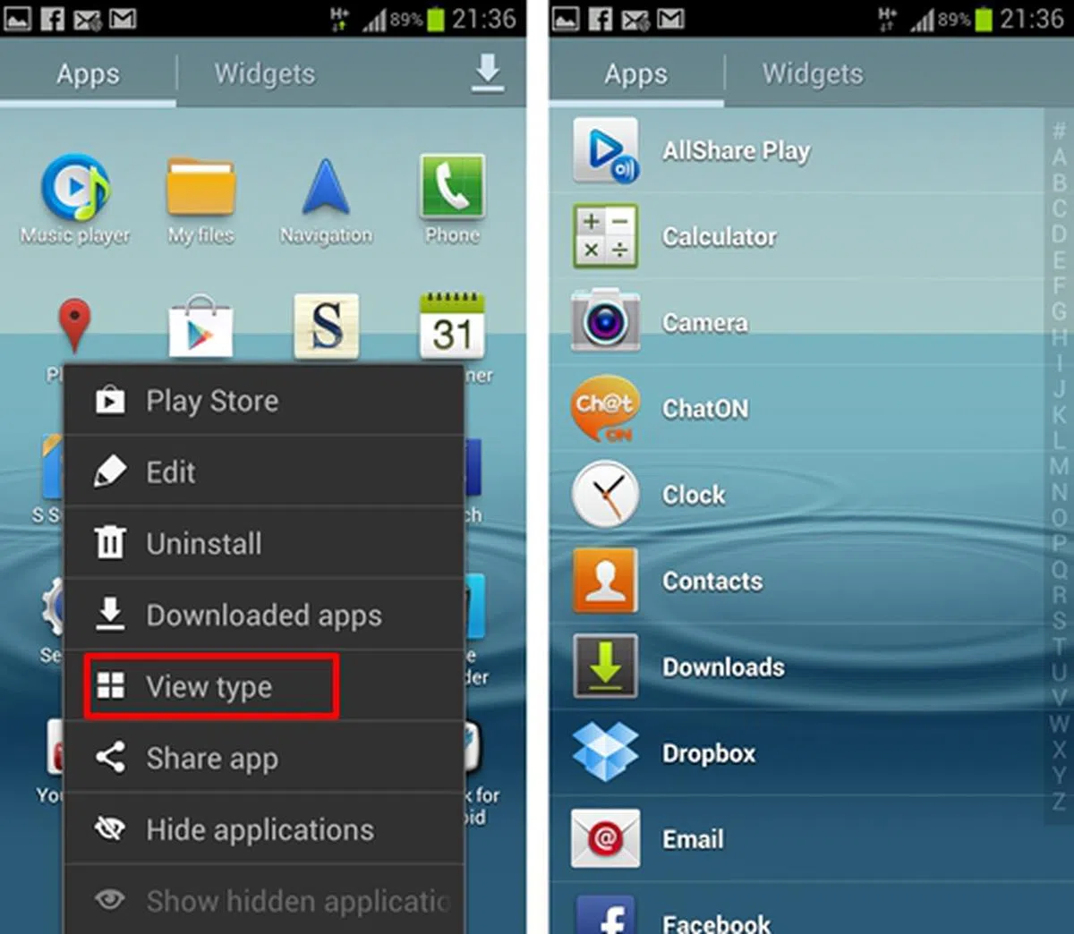 Tapping on the menu capacitive touch button reveals a bevy of options including a straight shortcut to Google Play Store, editing pages, hiding applications and viewing only downloaded apps. You can also view your app drawer in three modes: Customizable (by grid), Alphabetical (by grid), Alphabetical (list; seen on the right). The first allows you to rearrange icons freely. If you find it easier to find your desired app by alphabetical order in a list, here's the option to exercise it. | |