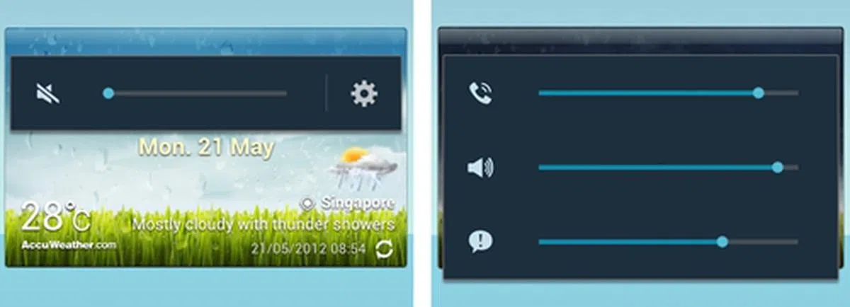 Tapping on the volume rocker opens up a mini menu with a small settings icon. Click on this icon to adjust the controls for calls, multimedia and notifications without the need to go into the full-fledged settings panel. | |