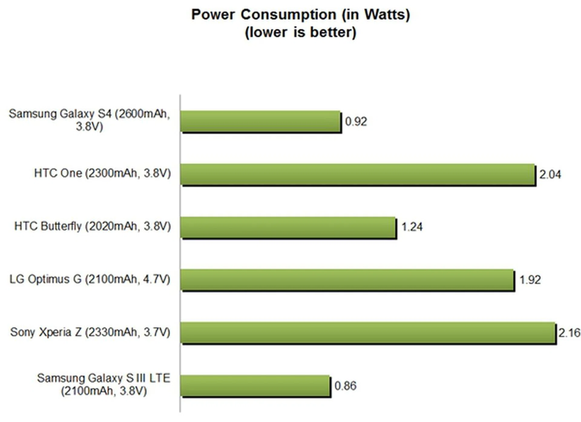This is not entirely unexpected since Samsung's flagship devices have always performed well in this aspect, thanks to the larger battery capacity, power efficient AMOLED display and good power management. As you can see in the power consumption chart, the Galaxy S4 has one of the lowest power consumption figures of 0.92W - well ahead of the competition.