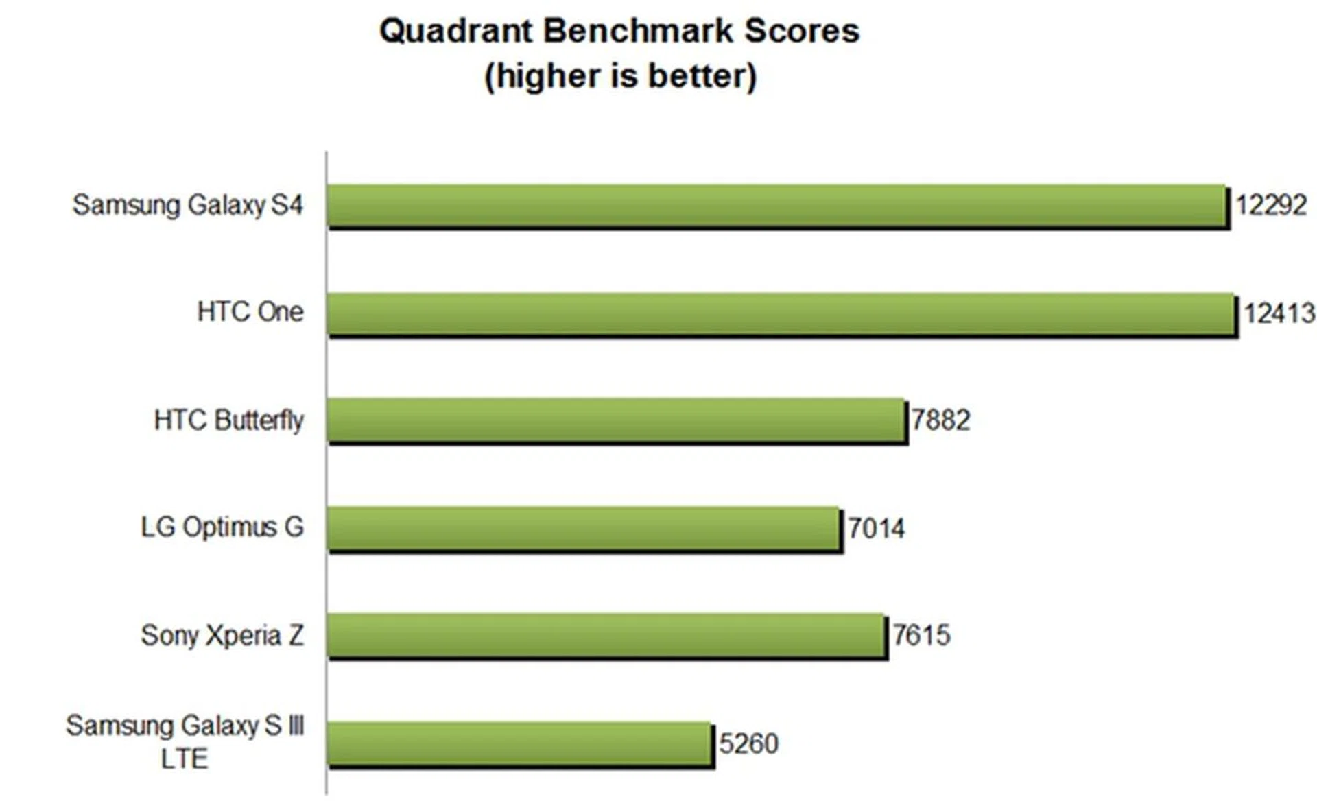 Not surprisingly, the Samsung Galaxy S4 and HTC One locked horns for the top spot in the Qudrant benchmark. The previous generation of S4 Pro-equipped Android smartphones (HTC Butterfly, LG Optimus G and Sony Xperia Z) is simply outclassed.
