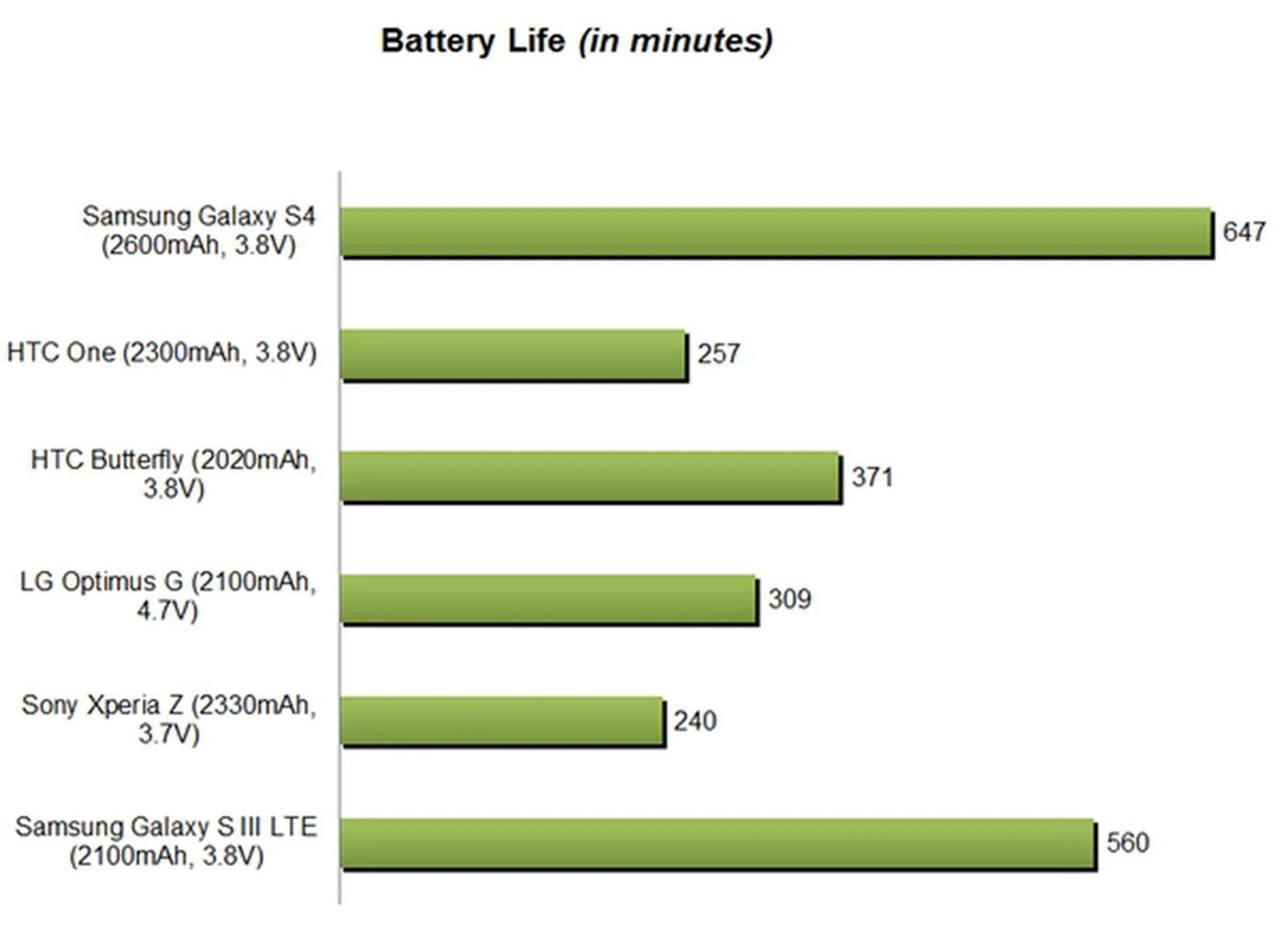 The Galaxy S4 lasted a whopping 10 hourrs 47 minutes, which is miles ahead of the current 5-inch competition. For example, the HTC One only managed a battery uptime of four hours and 17 minutes and the Sony Xperia Z came in shorter at four hours.