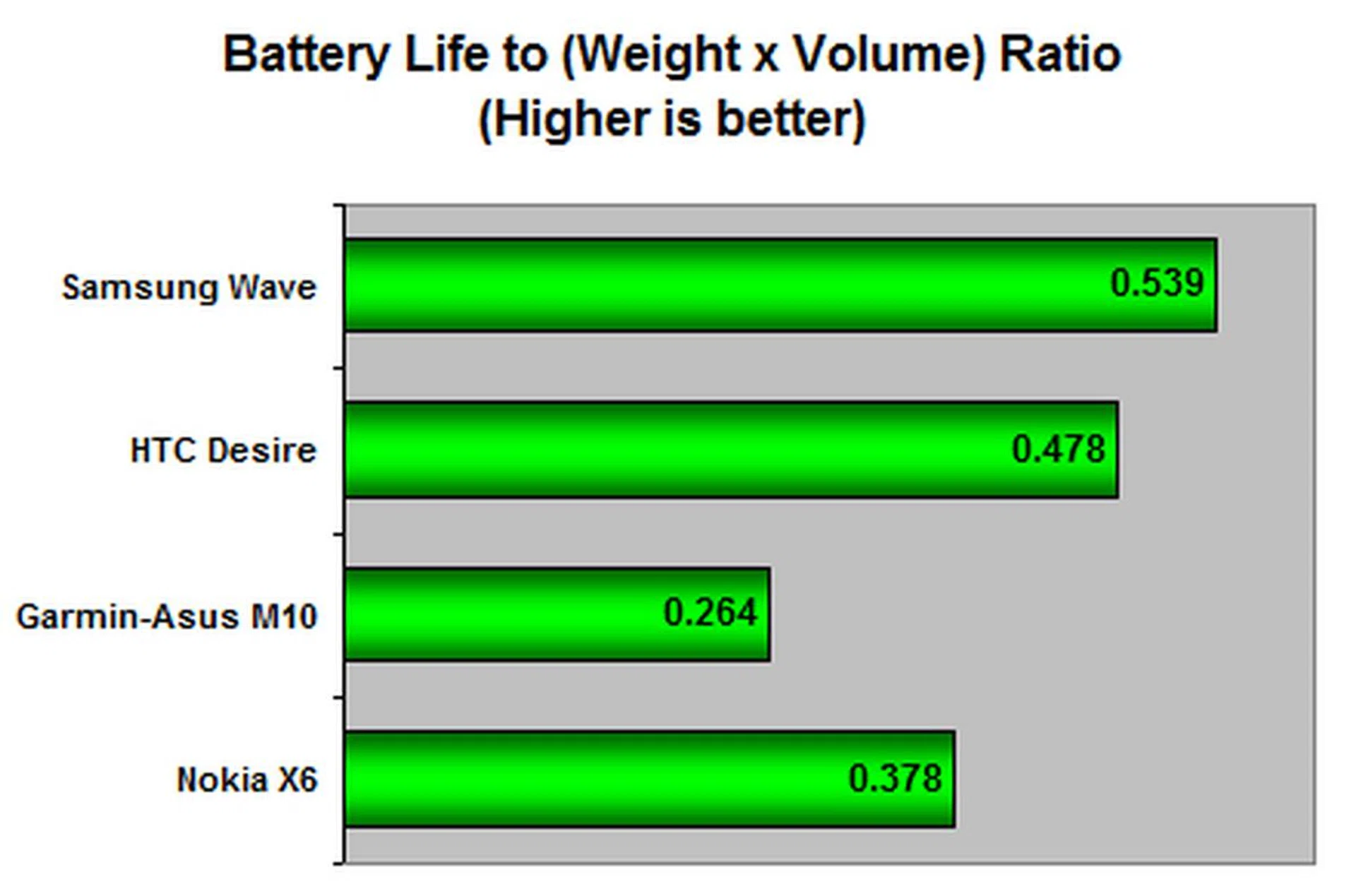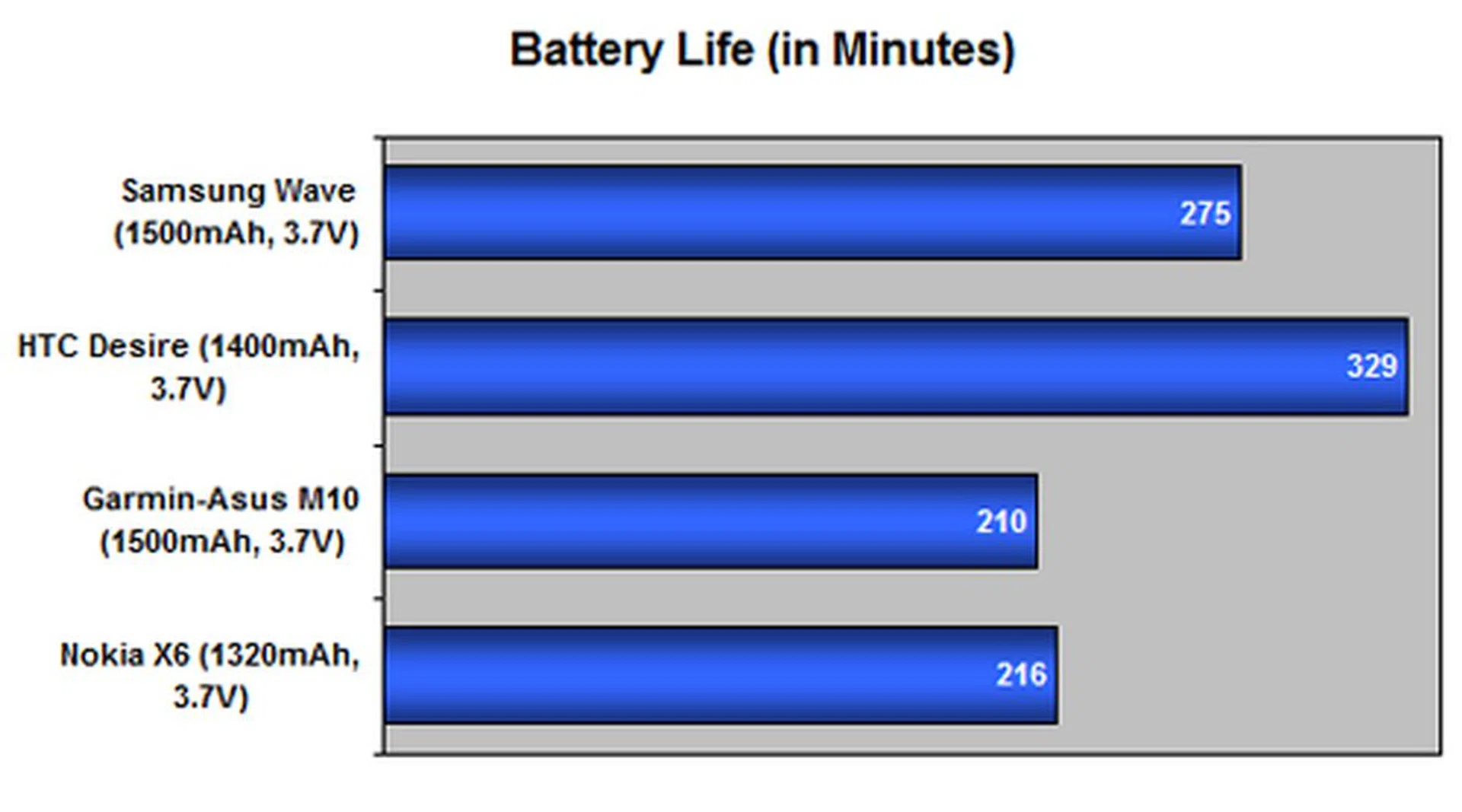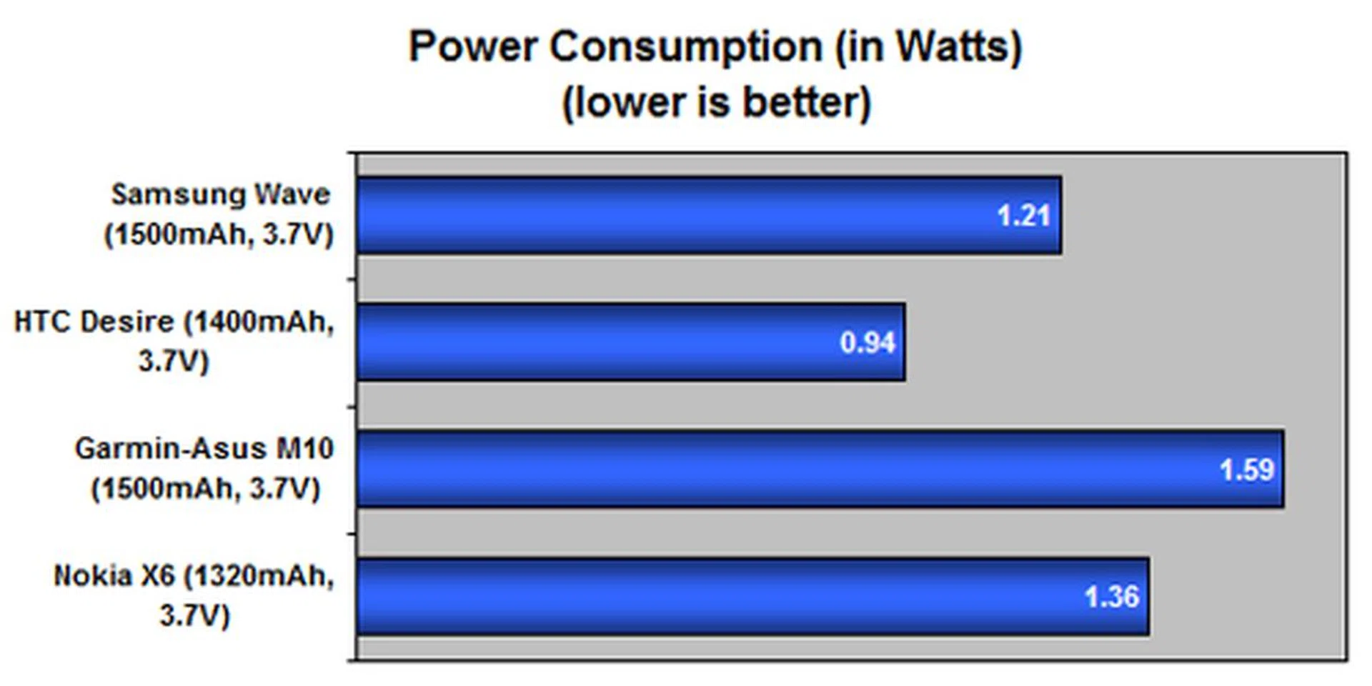 We rounded up the various mobile OS in this comparison to give you a better gauge of how the Wave's bada OS performed. Looking at Android (HTC Desire), Windows Mobile 6.5 (Garmin-Asus M10) and Symbian (Nokia X6) devices with similar specifications, we find Android scoring quite well in the power management scene.