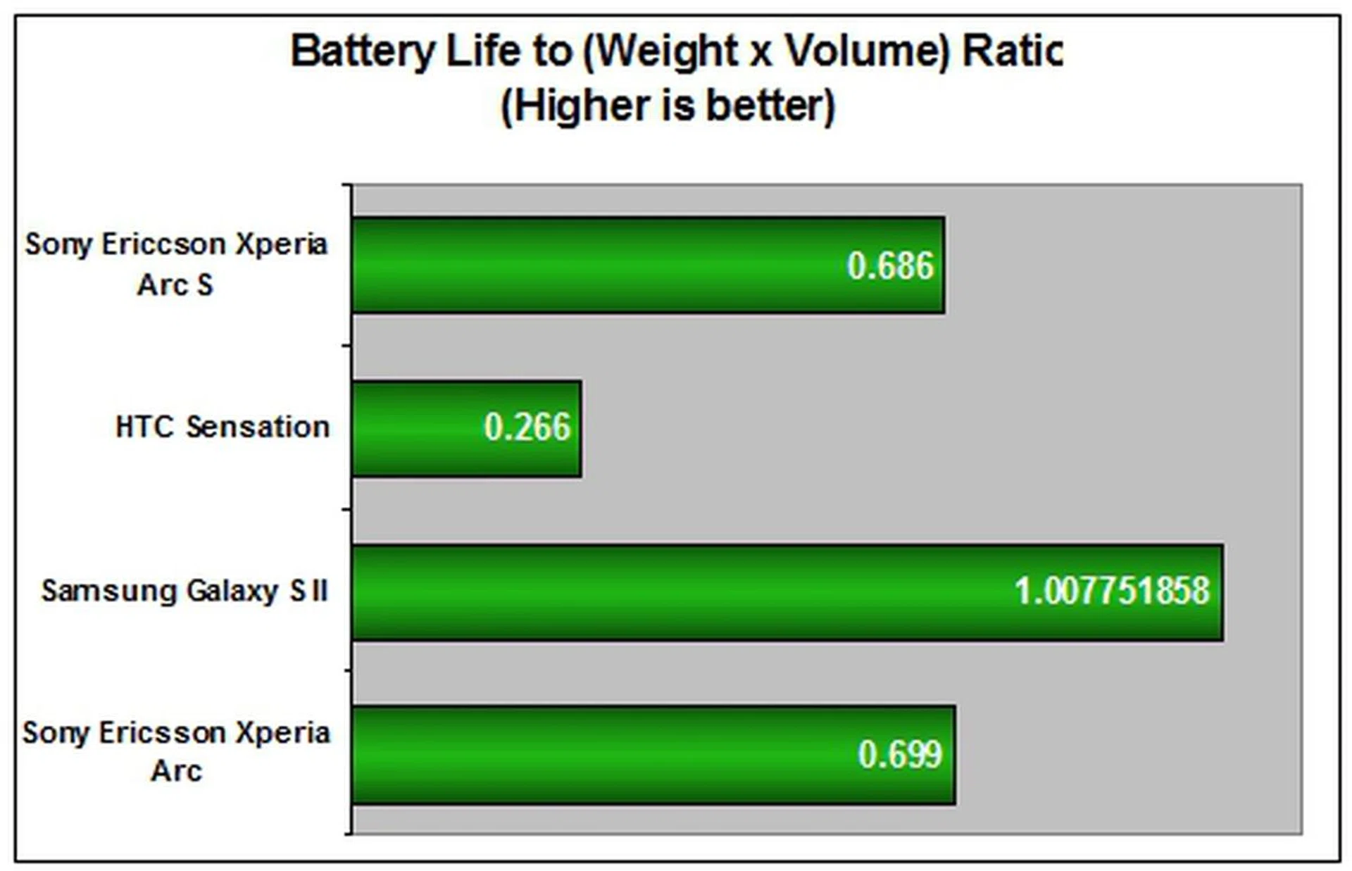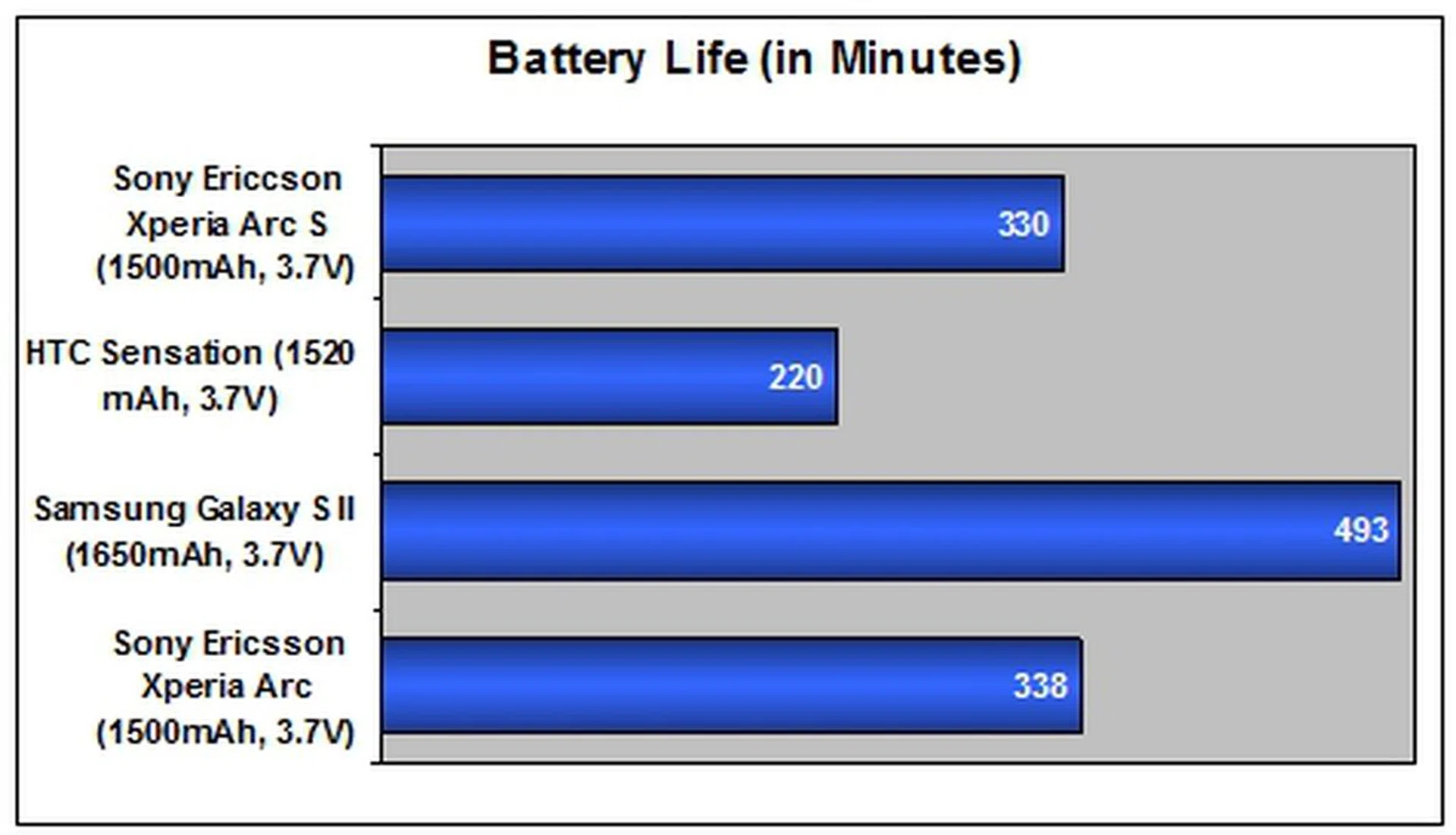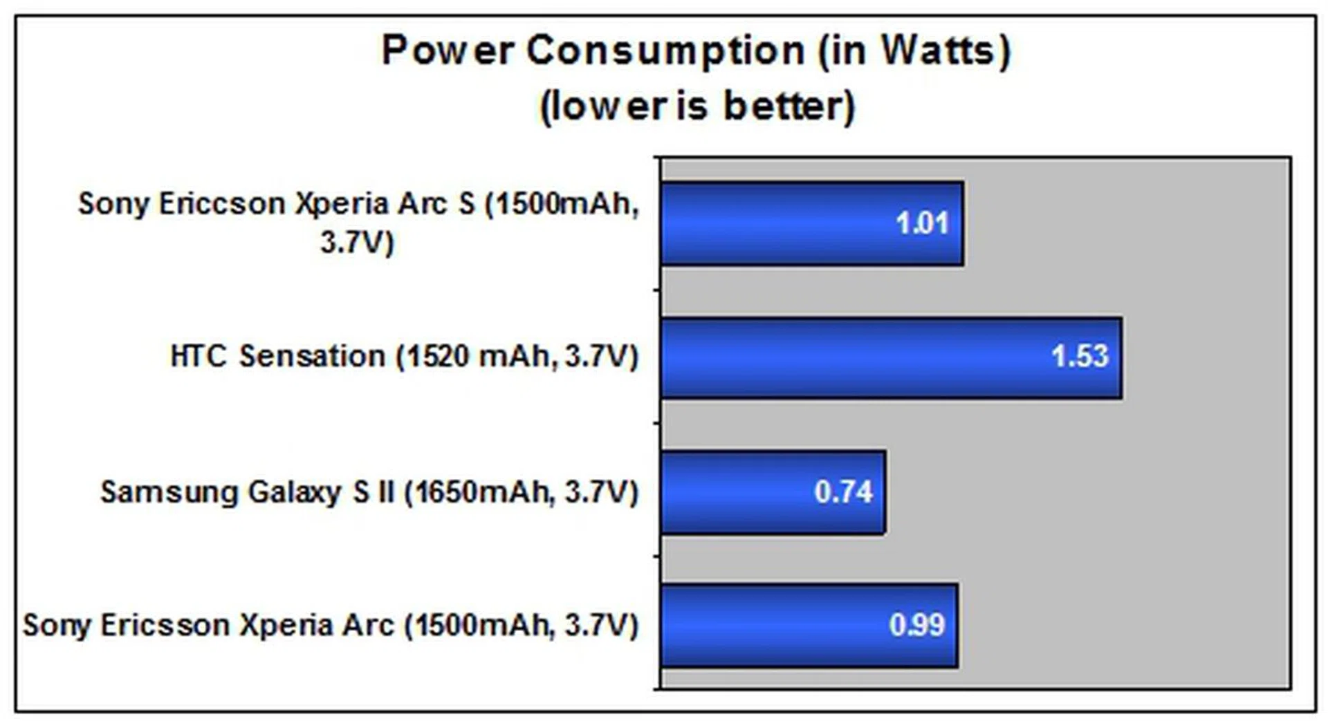 With an advantage of eight minutes, the Xperia Arc did just slightly better than the Arc S. We suppose this might be due to the new phone's more powerful (hence, more battery-consuming) 1.4GHz processor. Given that other factors like battery capacity, dimensions and volume were the same on both devices, results for both power consumption and portability index were almost identical. The Arc was light, thin and had reasonable (but not fantastic) battery performance to begin with, and we were glad that these results were similarly sustained on the Arc S.