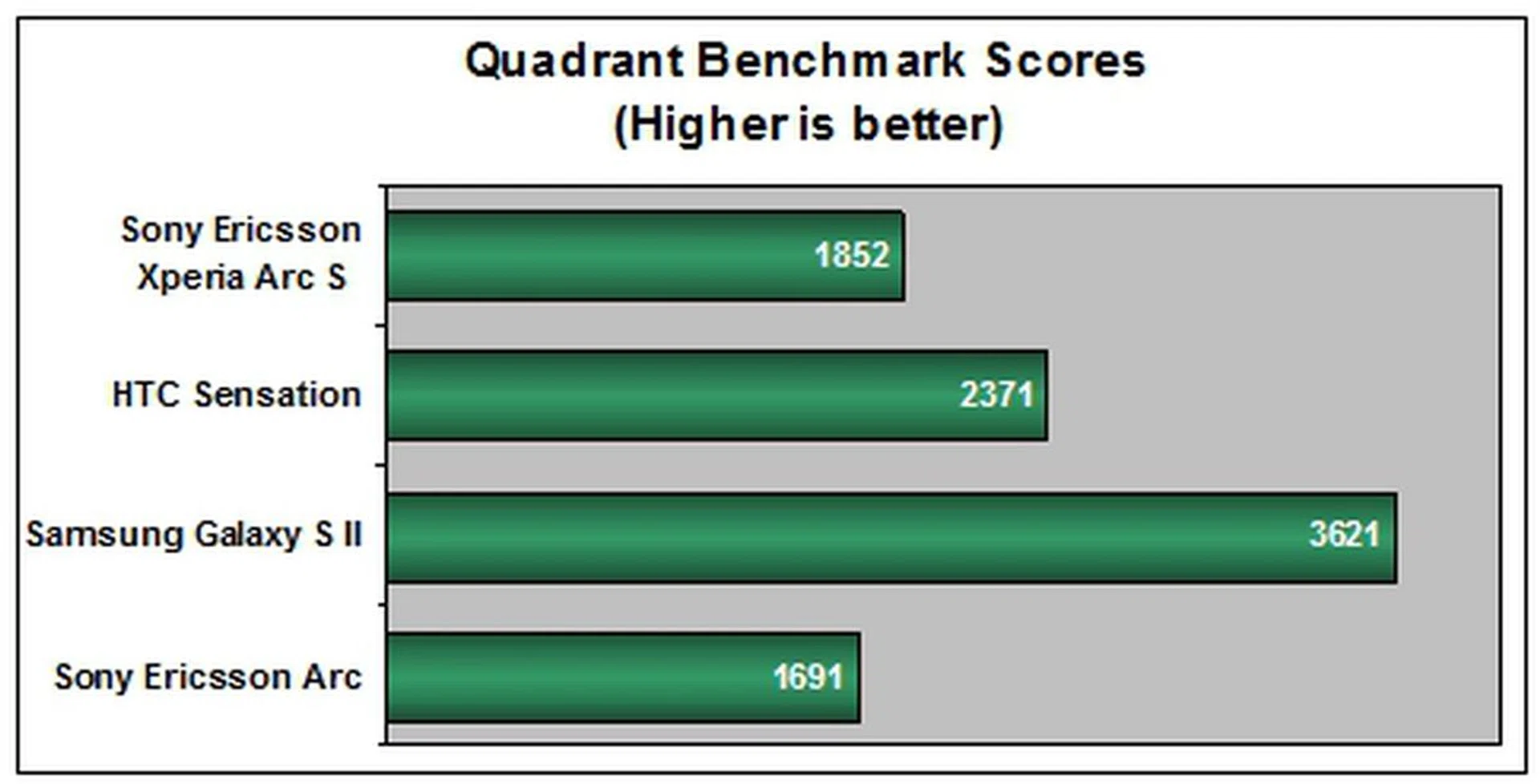 If you look at the Quadrant benchmark scores, the Arc S did slightly better than its predecessor. Unsurprisingly of course, since the Arc S comes with a faster and more powerful 1.4GHz processor. To give you a good gauge of how the Arc S's score compares to the dual-core smartphones, we have also included the latest two smartphones from that particular category. As you can see, the Arc S sits comfortably almost halfway in between the Arc (1GHz) and HTC Sensation (dual-core 1.2GHz), with Samsung's Exynos chipset still taking the lead.