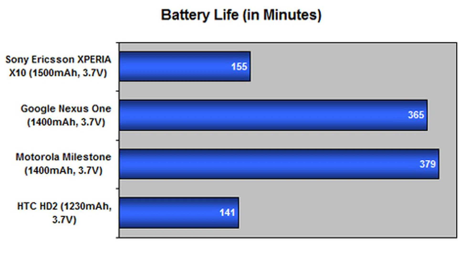 The results are obvious for all - the X10 won't be suitable for heavy usage on the road. Clocking 2 hours 35 minutes for our battery test and considering its higher battery capacity, the X10 is ranked lower than devices such as the HTC HD2 and Google Nexus One with similar (or larger) screen sizes and lower battery capacity. While it's not surprising to see how the Motorola Milestone managed to fare better with its smaller screen and managable processor, it's still a good indication of how the X10 fares against its Android siblings. For the moment, the Google Nexus One claims ownership of the best battery performance and portability index of almost all Android devices out there.