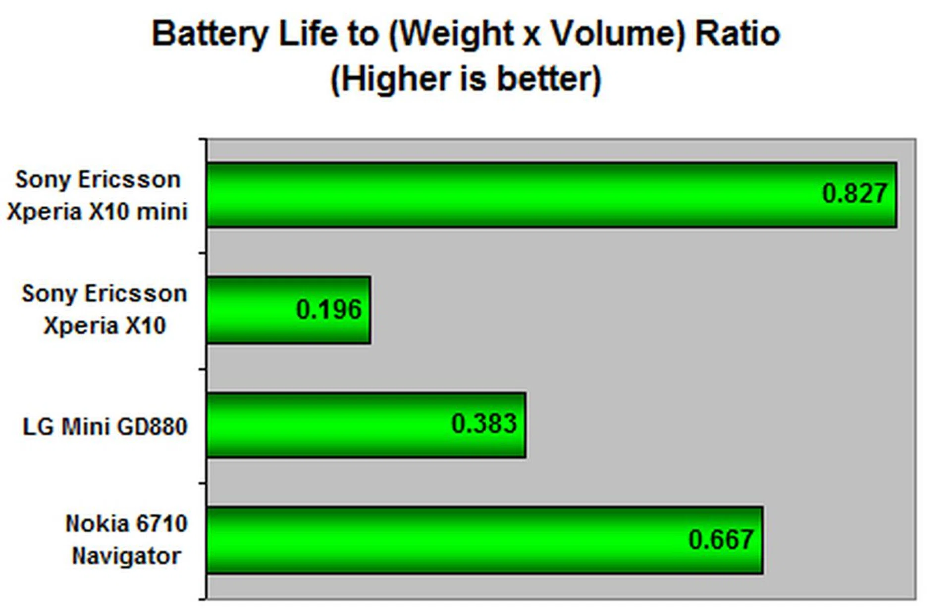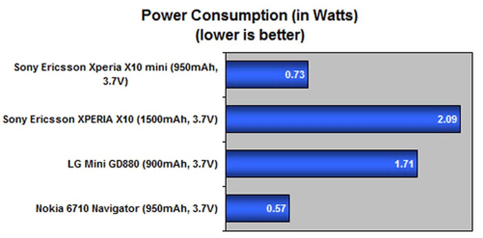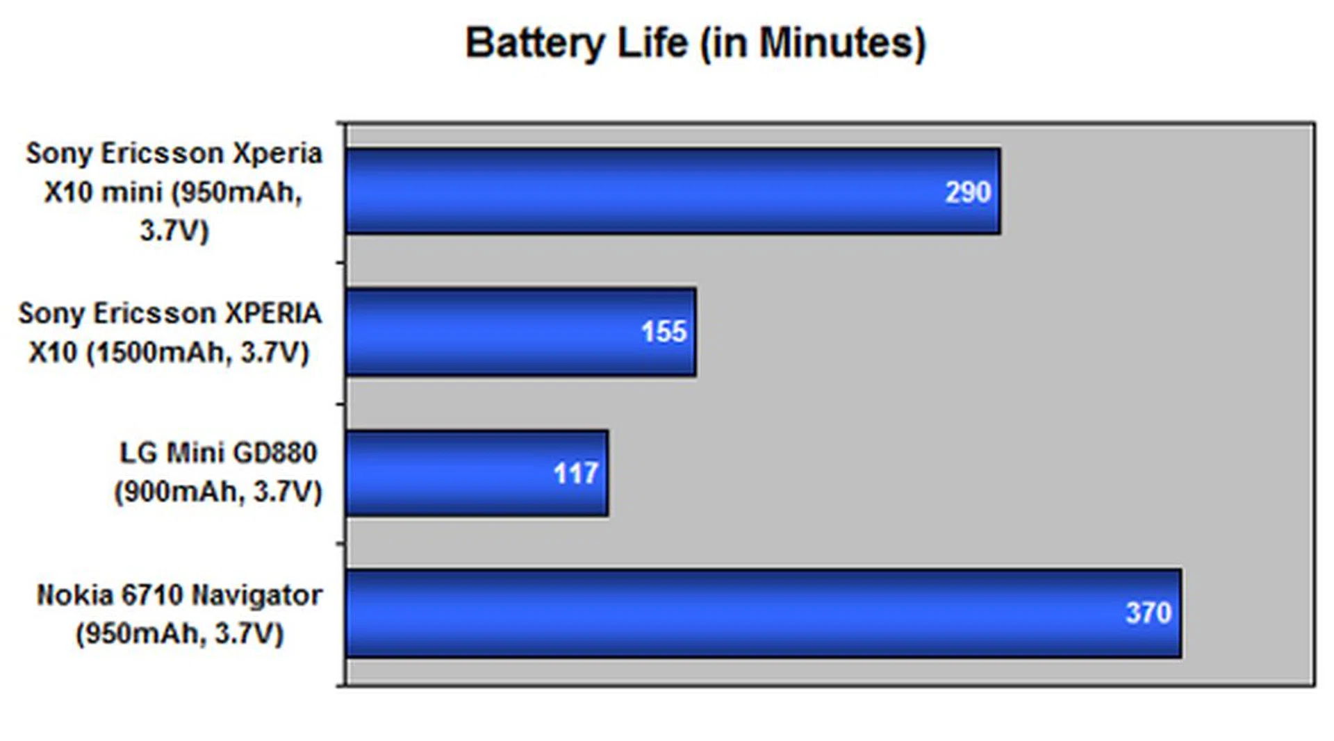 While the X10 suffers from a battery mileage issue, the X10 mini managed to avoid that problem even at its 950mAh battery capacity. The one possible attribute would be its smaller screen size and lower resolution, which equates to less power consumption. This is supported further from the LG Mini results, which has a larger screen size at WVGA resolutions and a similar battery capacity to the X10 mini. Nonetheless, there's still room for improvement with its power efficiency, as we see when we compare it against the Nokia 6710 Navigator's 6 hours operation time in this harsh test.