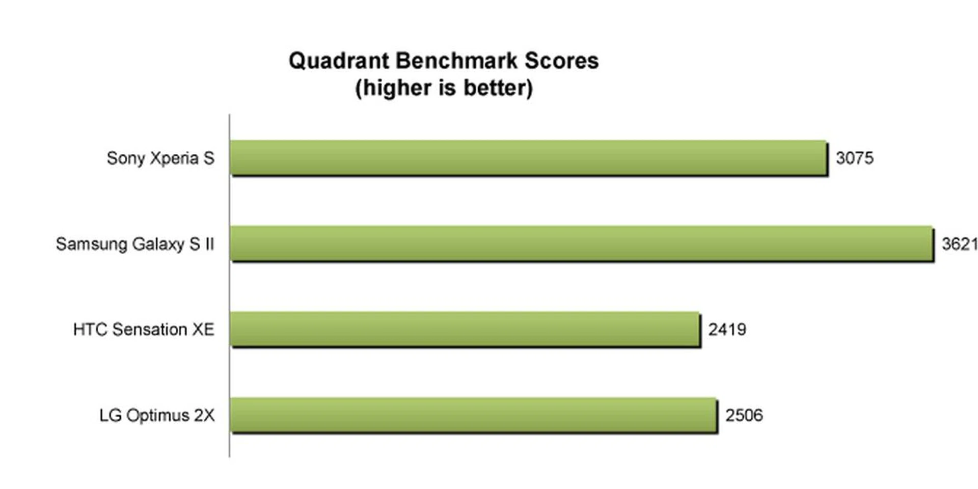 As depicted in the chart above, the Xperia S fared quite well against the Sensation XE and LG Optimus 2X. Against NVIDIA’s Tegra 2 processors, we have seen the Qualcomm Snapdragon MSM8260 chipset performing better in numbers. Comparing the Sensation XE and Xperia S, both of which are using that particular Qualcomm processor, we can deduce that the higher Quadrant score for the Xperia S means Sony has managed to optimize its user interface much better than HTC Sense.