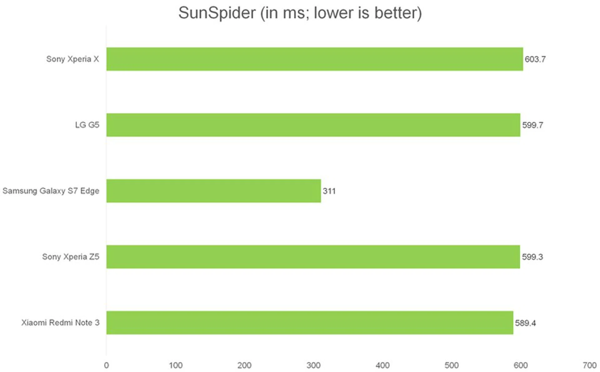 SunSpider JavaScript measures the browsing performance of a device when processing JavaScript. It not only takes into consideration the underlying hardware performance, but also assesses how optimized a particular platform is at delivering a high-speed web browsing experience. The Sony Xperia X sits comfortably in this benchmark.