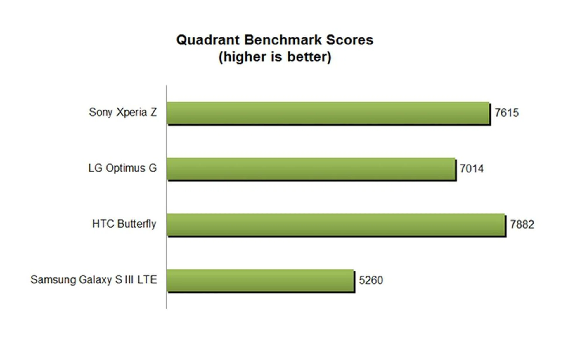 With all three phones (Xperia Z, Optimus G, Butterfly) equipped with the same Qualcomm Snapdragon S4 quad-core 1.5GHz processor, 2GB of RAM, and Adreno 320 GPU, it isn't that surprising to see the Xperia Z scoring an acceptable 7615, a score that's just slightly behind HTC Butterfly's. In comparison, the Galaxy S III's last-gen Exynos quad-core chip has finally showed its age with a lower score of 5260.