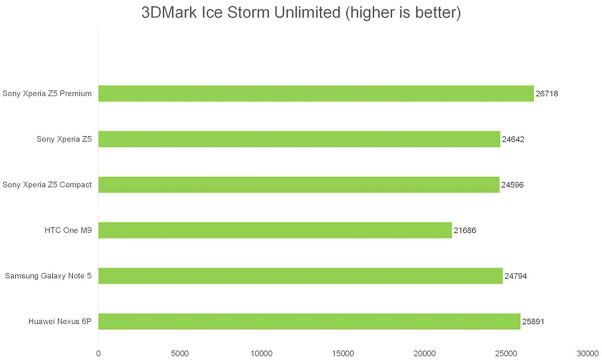 We ran 3DMark’s Ice Storm Unlimited test, which uses a mix of graphics and physics tests to measure hardware performance. The first test measures the GPU’s ability to process lots of vertices, while the second does the same thing with lots of pixels and post-processing effects. Finally, the physics test switches the load to the CPU to test its ability to process physics simulations, while keeping GPU load low. The Z5 phones generally scored well in this benchmark and we had no issues with games across different processing requirements. Performance-wise, the Z5 phones are a very well rounded trio with no significant issues.
