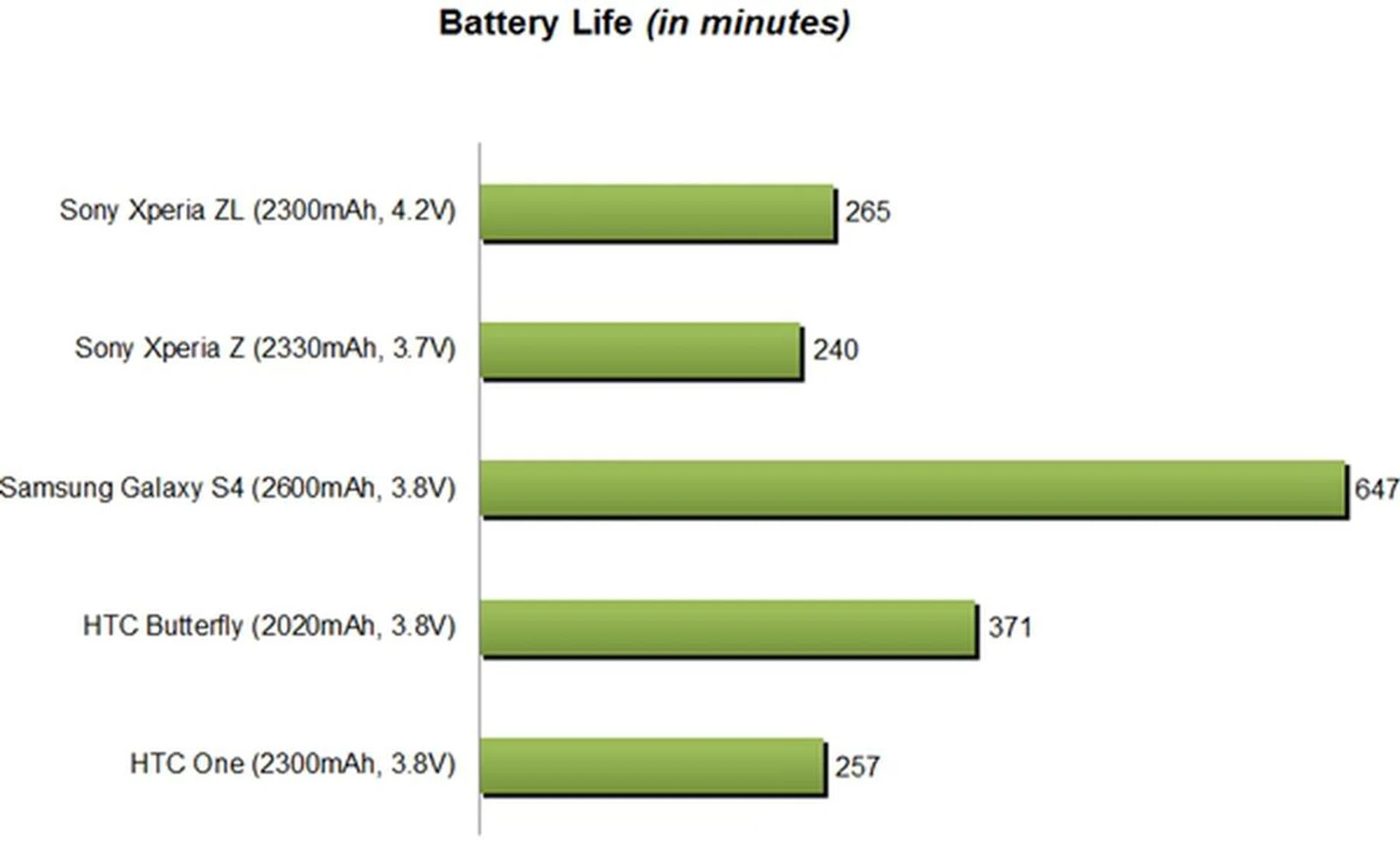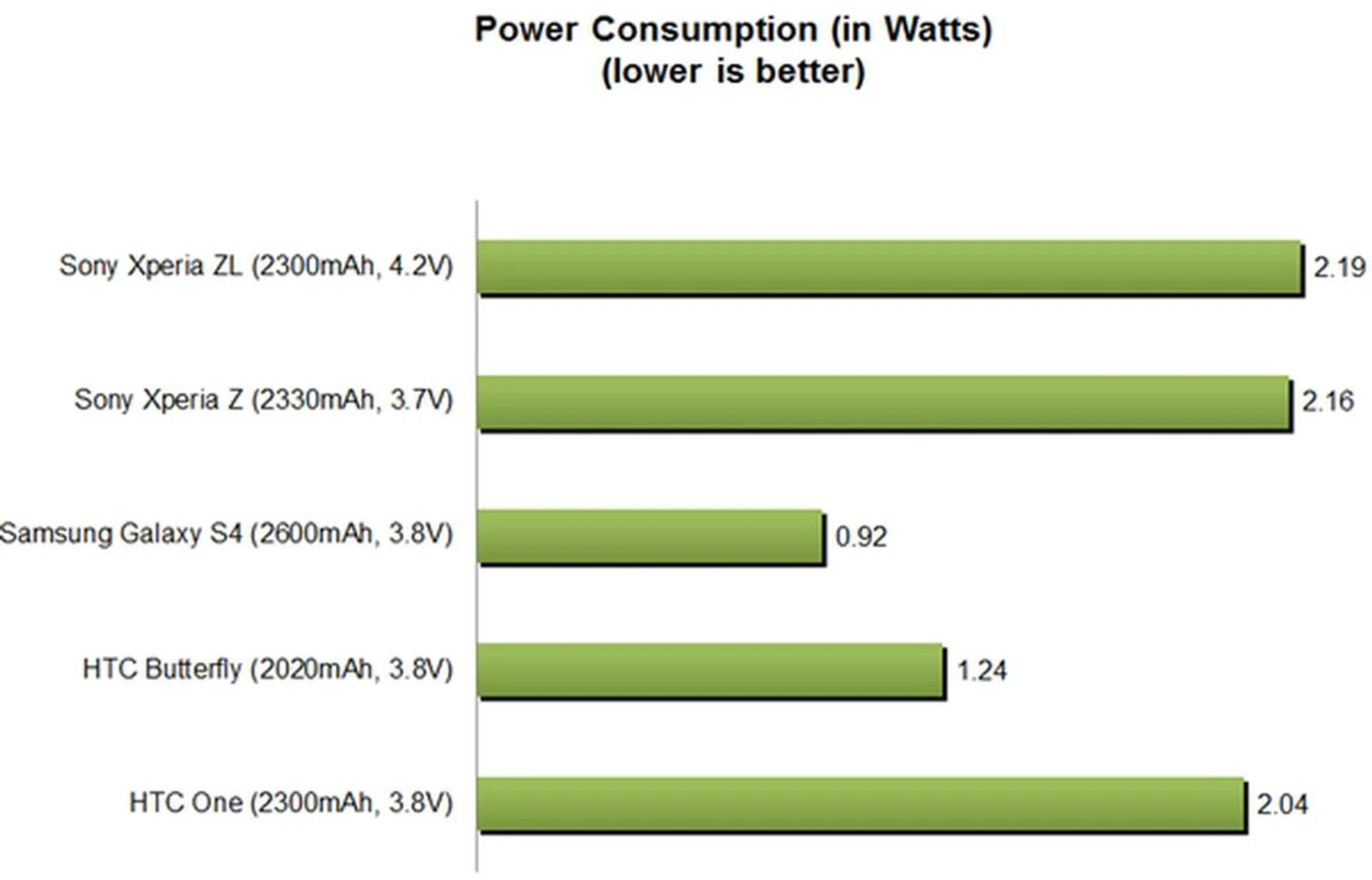 The Xperia ZL lasted 25 minutes longer than the Xperia Z in our battery test even though it comes with a smaller 2,300mAh battery. This can be attributed to its slightly higher battery voltage of 4.2V, thus giving it a higher overall battery capacity. The battery up-time is on-par with the HTC One, but drew slightly more power as seen in the power consumption chart.