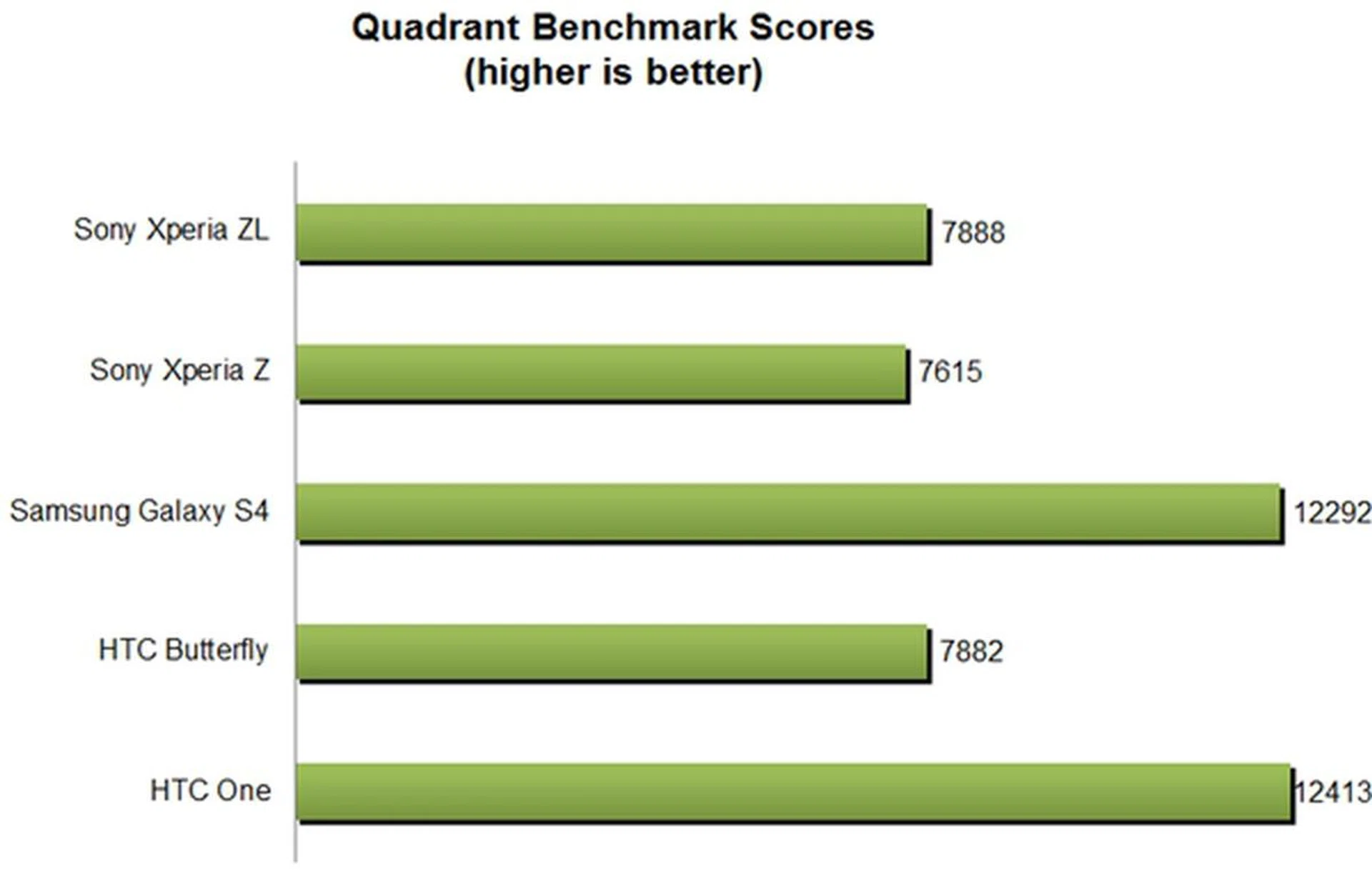 To find out how the Xperia ZL stands amongst its peers, we use the Quadrant test as a benchmark. The test evaluates CPU, memory, I/O and 3D graphics of Android devices. In this comparison, we pit the device against the Samsung Galaxy S4, HTC One, HTC Butterfly and Sony Xperia Z.