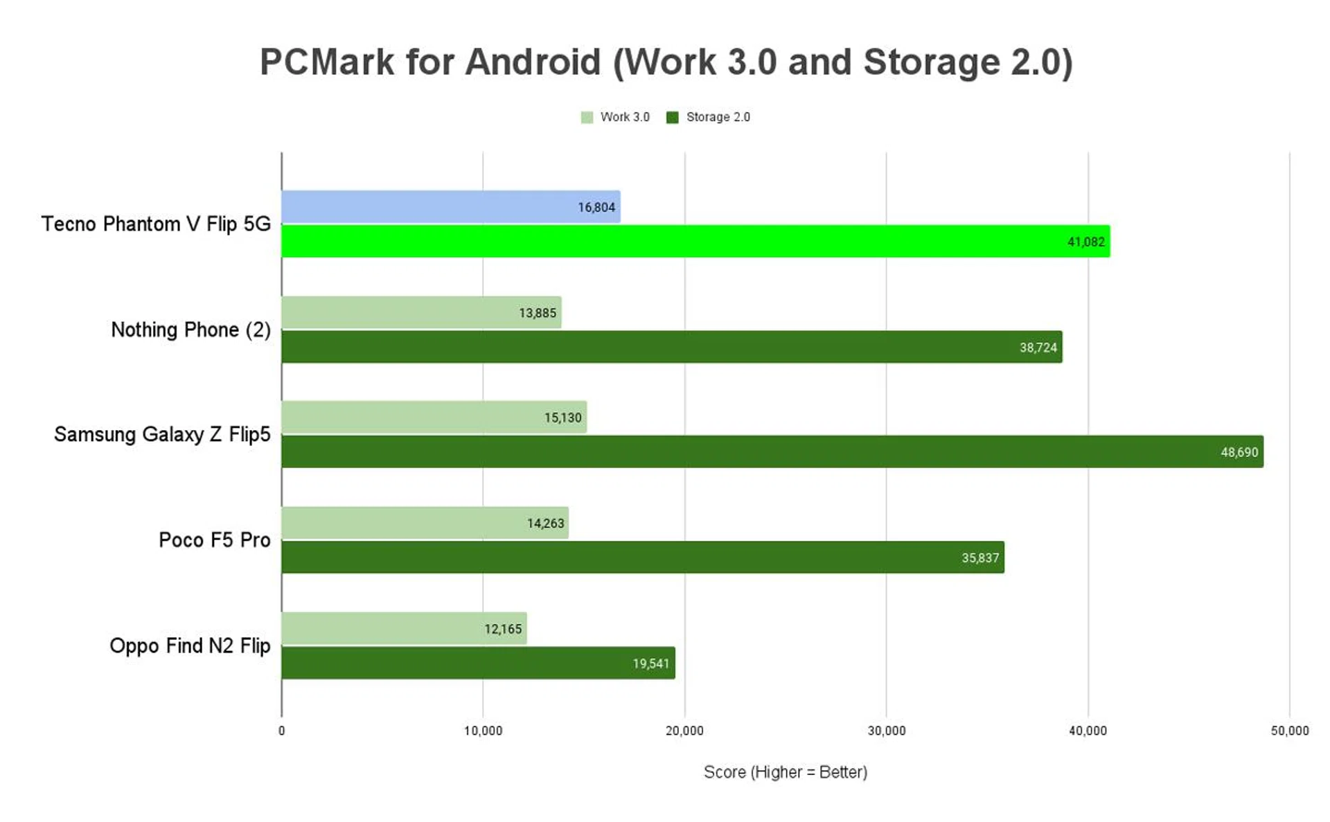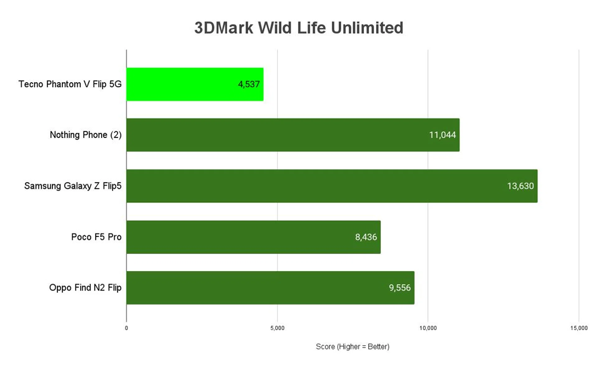 The Tecno Phantom V Flip 5G’s raw power is understandably nowhere as robust as the Oppo Find N2 Flip’s, considering that the latter uses a higher-grade chipset than Tecno’s. Despite the difference in synthetic scores, the Phantom V Flip 5G still holds up very well in everyday use and doesn’t get beyond 38°C. This can be inferred from the benchmarks: it does well in simulated everyday use, but it can't run mobile games at the same level as its rivals.
