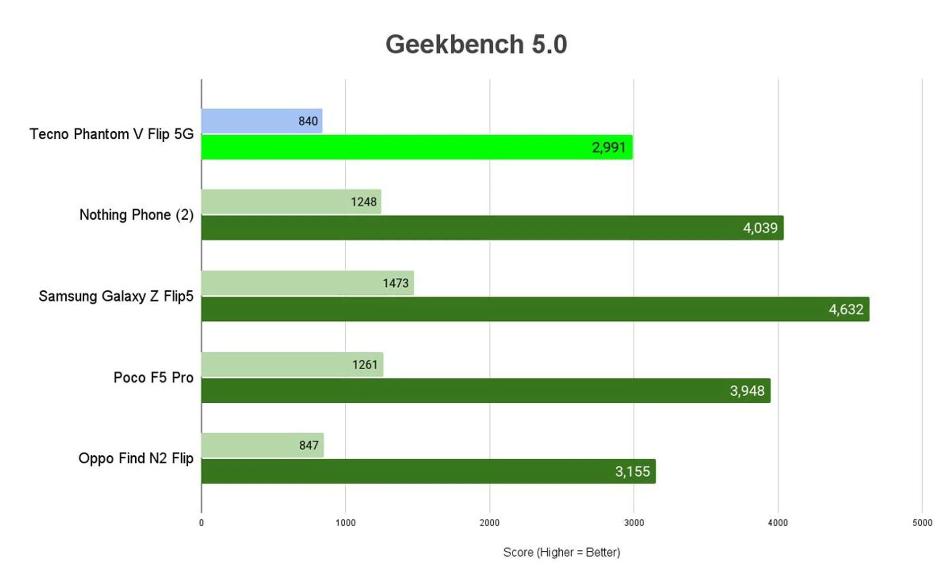 Tecno Phantom V Flip runs on a MediaTek Dimensity 8050 5G processor, a 2023 mid-range chipset made on a 6-nanometre manufacturing process. If you’re curious, MediaTek’s flagship equivalent is Dimensity 9000 (used in the Oppo Find N2 Flip), and 9000+. Explaining the grading of processors can be a bore, especially to users drawn towards clamshell phones for their aesthetics and form factor. So, we’ll let the benchmark scores below do the talking instead.