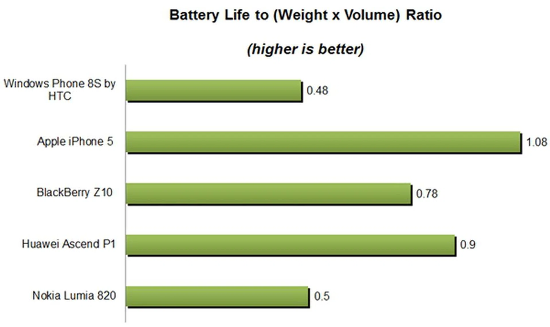 In the Portability Index where the overall dimensions, weight and battery performance are taken into consideration, the WP8S fared the worst with the lowest ratio. The Nokia Lumia 820 was ahead with a marginally better score, but it would have scored a lot better if not for its hefty weight. The WP8S may be the second lightest device, but it is also the thickest and has the worst battery performance among the phones compared.