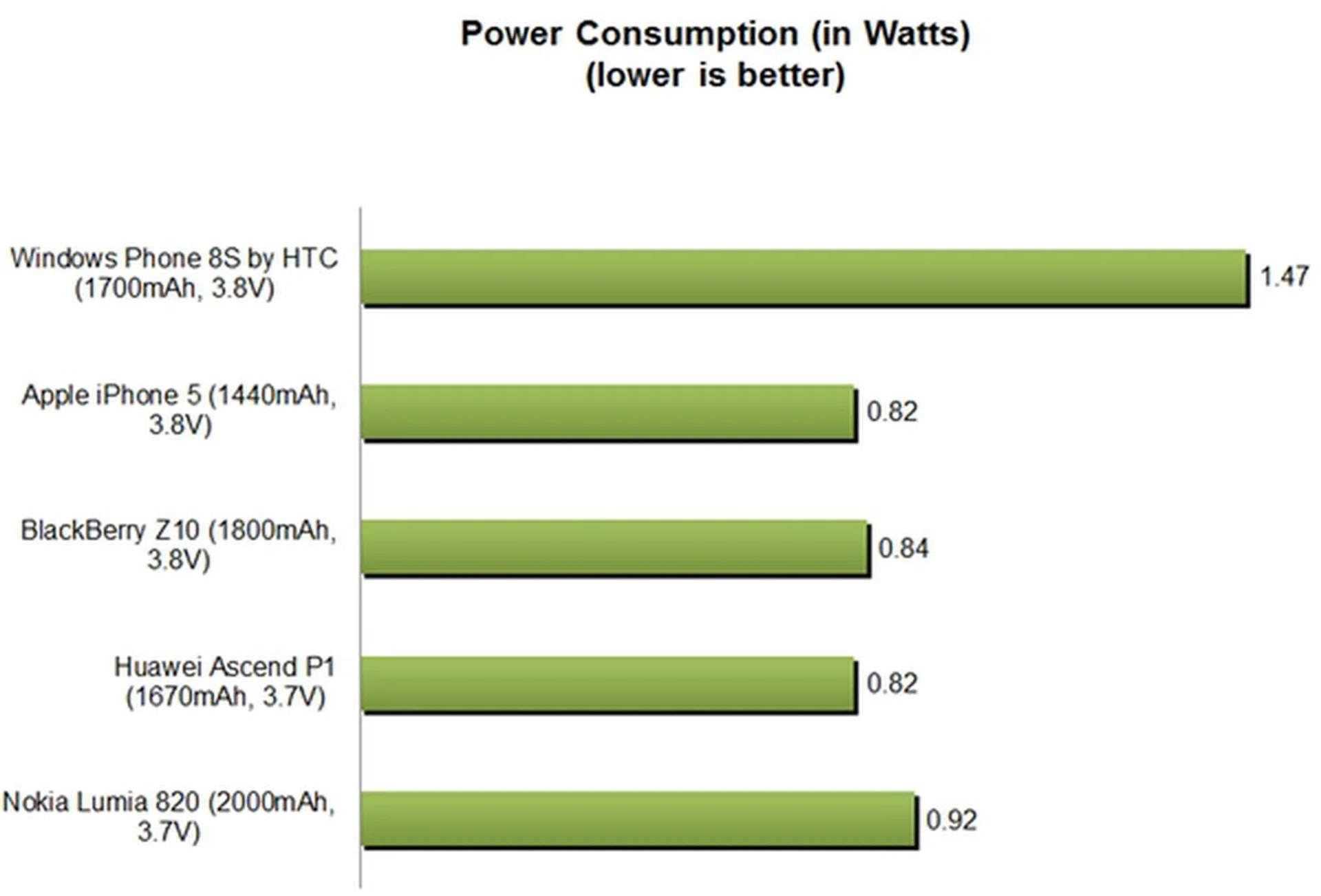 Like the WP8X, the WP8S ranked last in our standard battery test with the lowest uptime of four hours and 23 minutes. This is quite disappointing considering that the 4-inch Apple iPhone 5 with a higher screen resolution and a smaller battery capacity could last longer. The low battery mileage of the WP8S can be attributed to its high power consumption of 1.47W, about 50% more than all other phones in this comparison.