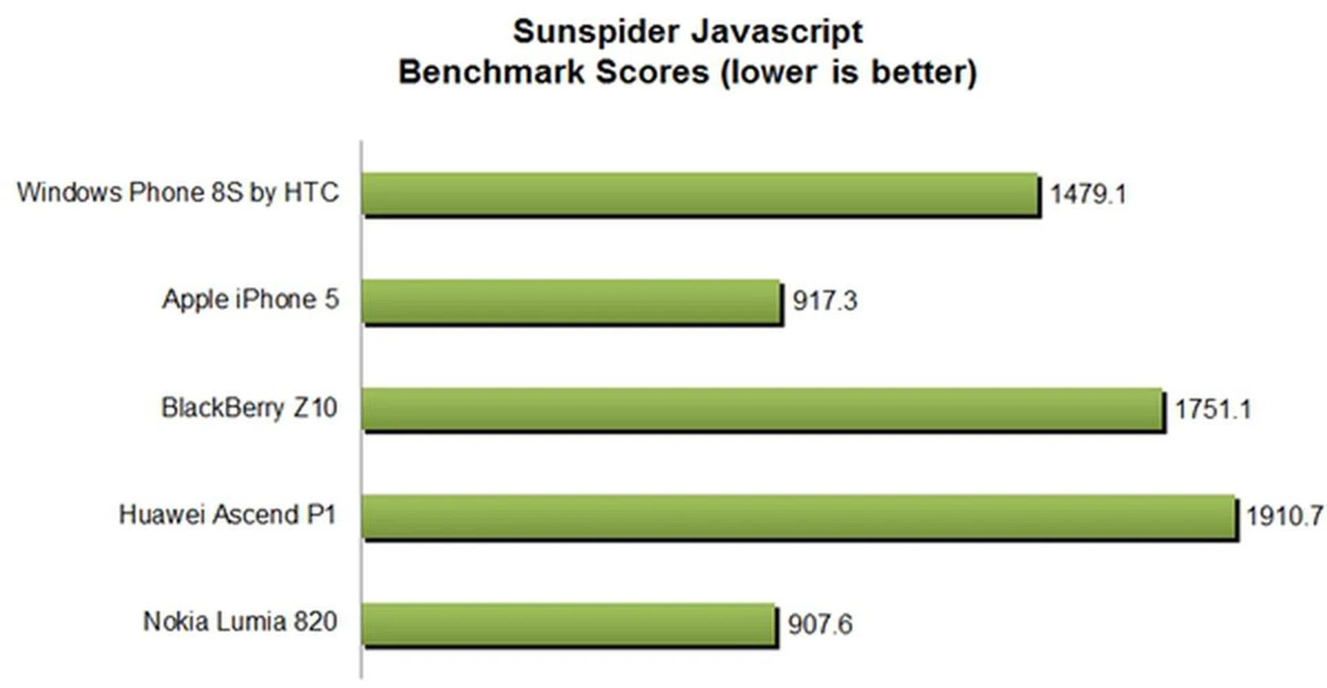 When it comes to web browser performance, WP8S fared worse than its WP8 counterpart, the Lumia 820. This can be attributed to its slower CPU and 512MB RAM. This benchmark measures JavaScript performance on tasks relevant to the use of JavaScript such as encryption and text manipulation; a lower score is a better. However, as mentioned earlier the general usage experience is good, but when subjected to benchmarks, the differences start to show.