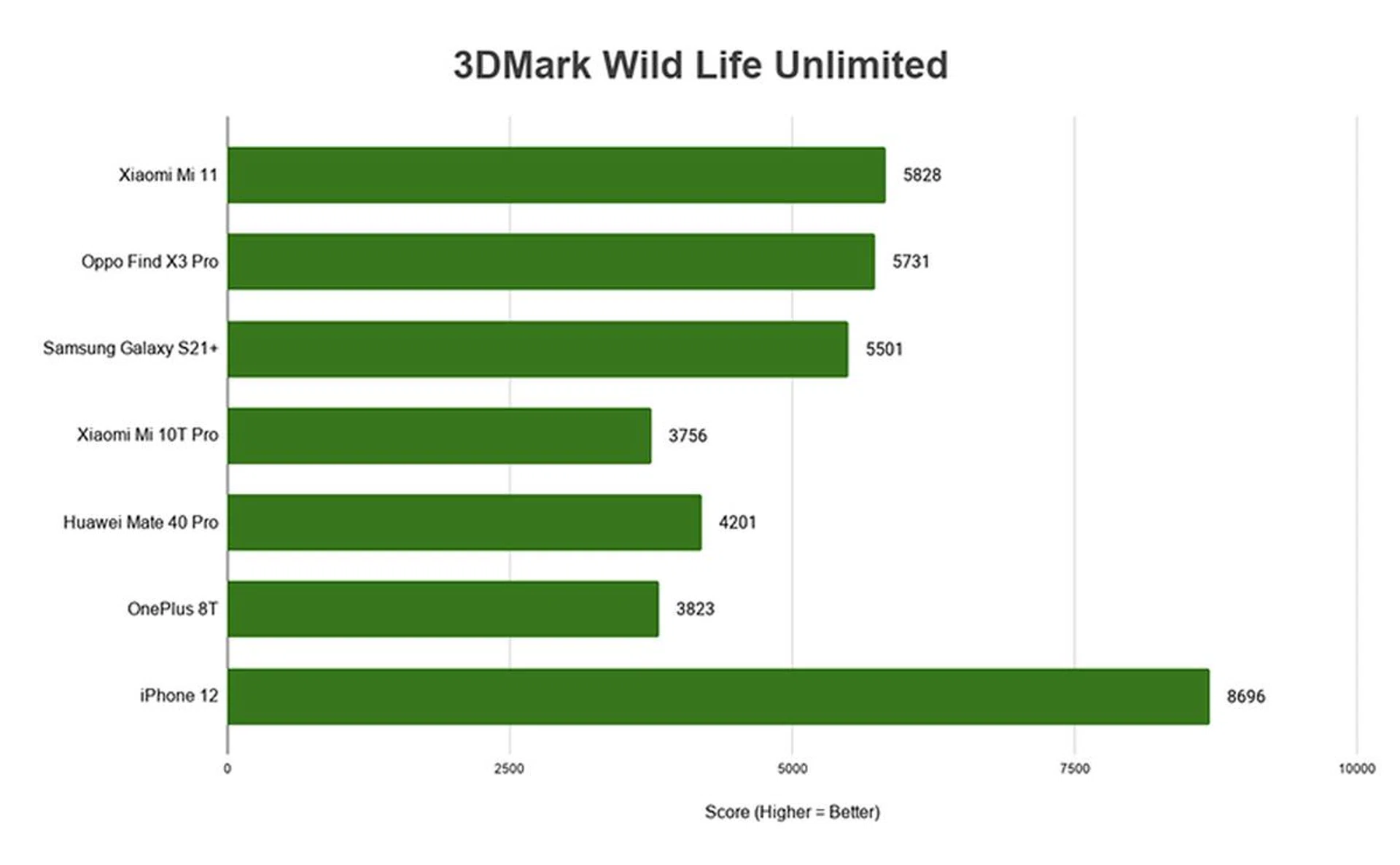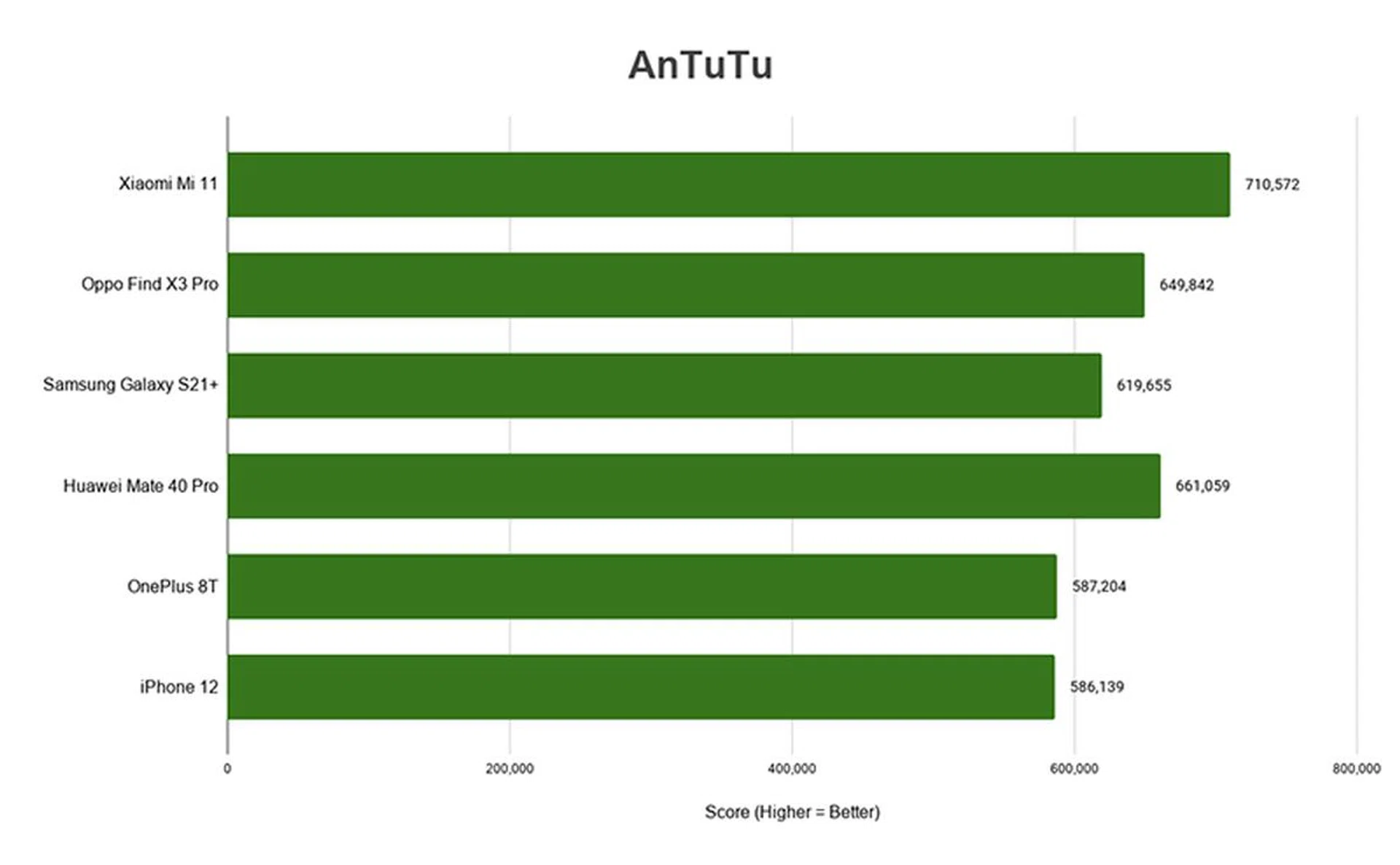 Our in-house tests saw over-inflated benchmark numbers by Mi 11 (an average of 801,530). It’s likely that the Mi 11 has been configured to fudge with benchmark results on AnTuTu, seeing how the Oppo Find X3 Pro with the same chipset didn’t report such numbers. As such, we’ve decided to feature the numbers published on AnTuTu’s own benchmark rankings instead, although we aren’t that confident with the public numbers either.