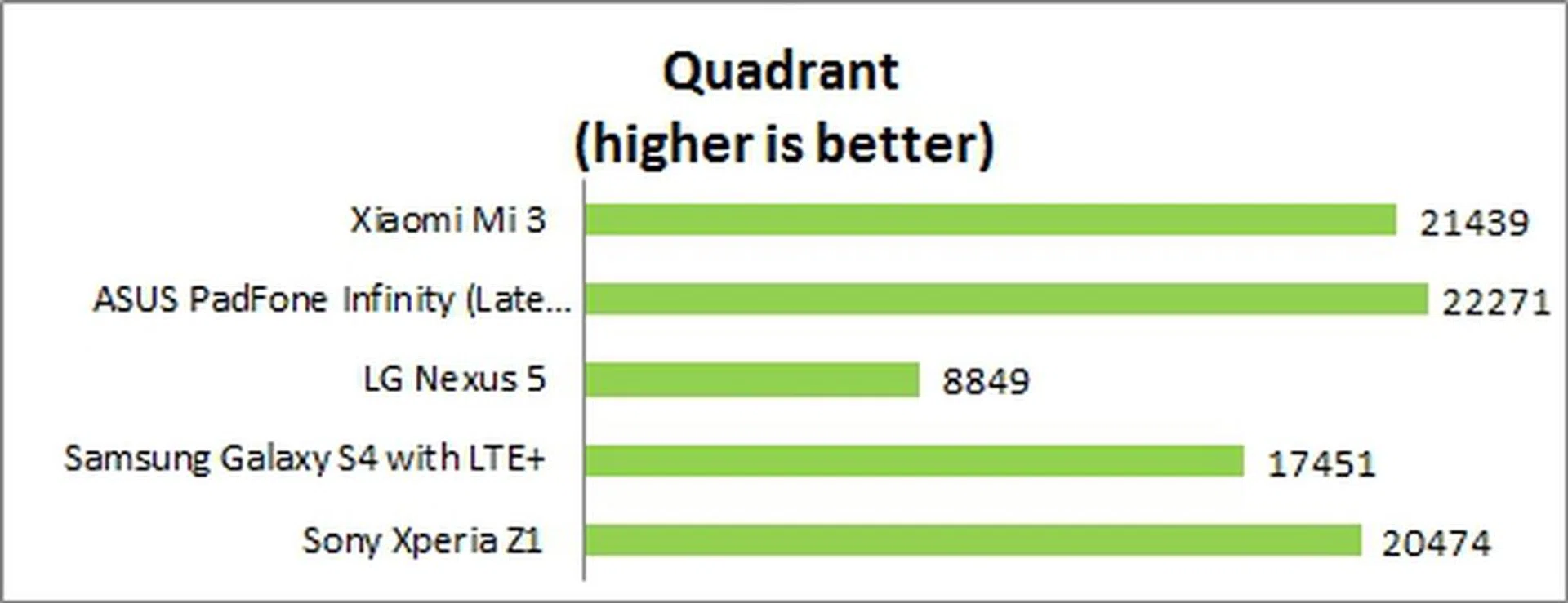 The Mi 3 held up pretty well against the other Android flagship smartphones with the second highest score of 21,439 in the Quadrant benchmark. The near-stock Android interface running on the PadFone Infinity might have contributed to a better performance.