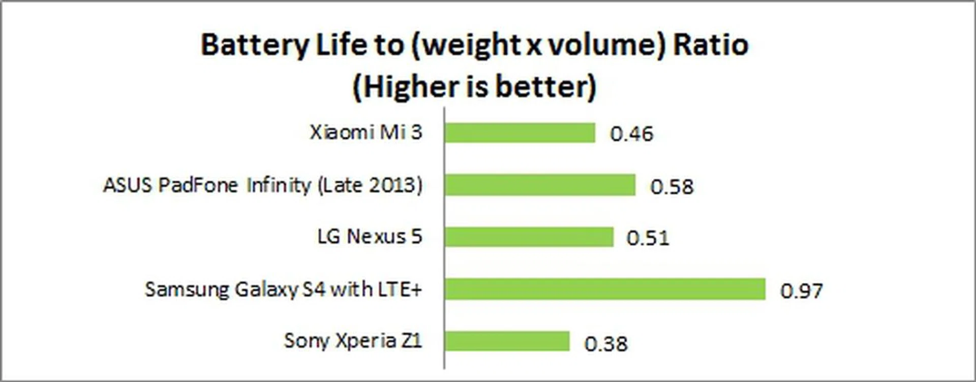 We measure the portability of a device by calculating its battery life to (weight x volume) ratio. Due to its average battery life, the Mi 3 ranked second last in the Portability Index even though it is one of the slimmest and lightest phones.