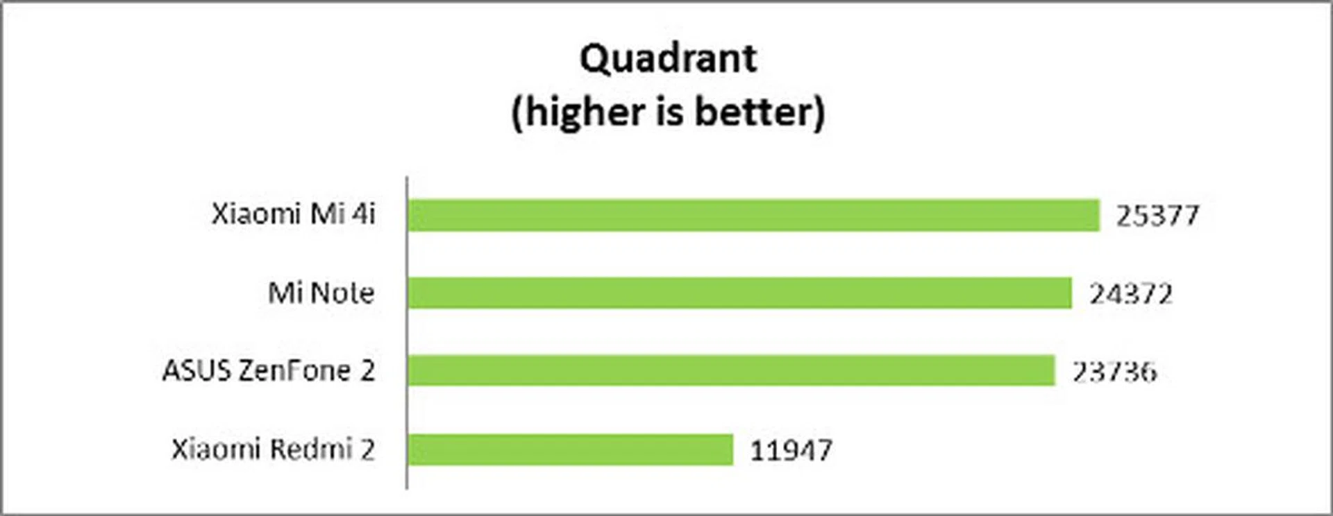 Quadrant is an Android benchmark that evaluates a device's CPU, memory, I/O and 3D graphics performance. The Mi 4i provides the option to either use the ‘Performance’ or ‘Balanced’ mode when running any processor-intensive task such as benchmarks or games, so we went along with the Performance mode in order to see what the Mi 4i was capable of. The Mi 4i’s second-generation Snapdragon 615 processor fared very well for this test, as it surprisingly beat the rest of the phones we pitted it against, including the Mi Note.