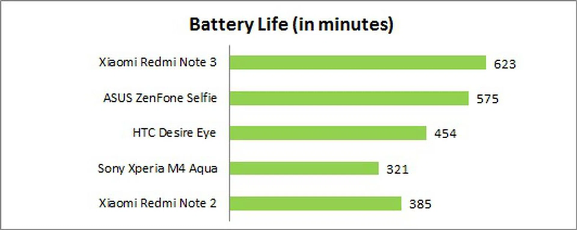 Armed with a huge 4,000mAh battery, the Redmi Note 3 lasted the longest at 10 hours and 23 minutes. That's about 48 mins longer than the ZenFone Selfie and close to four hours longer than the Redmi Note 2. Perhaps the use of a more power-efficient processor helped the Redmi Note 3 last much longer than its predecessor considering that they have the same screen size, resolution and run on the same software version.