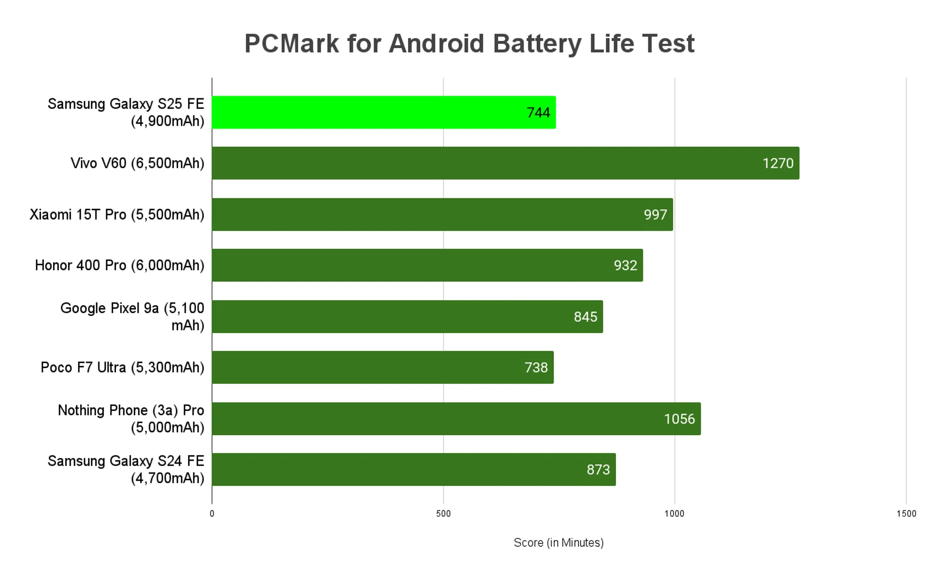 The Samsung Galaxy S25 FE’s 4,900mAh battery managed nearly 12.5 hours of uptime on our standardised battery test. It has a good uptime, lasting the better part of the day (with 20% more to spare, per our battery benchmarking parametres). Unfortunately, it was surpassed by other budget flagship contenders with either larger capacities or better power efficiency.