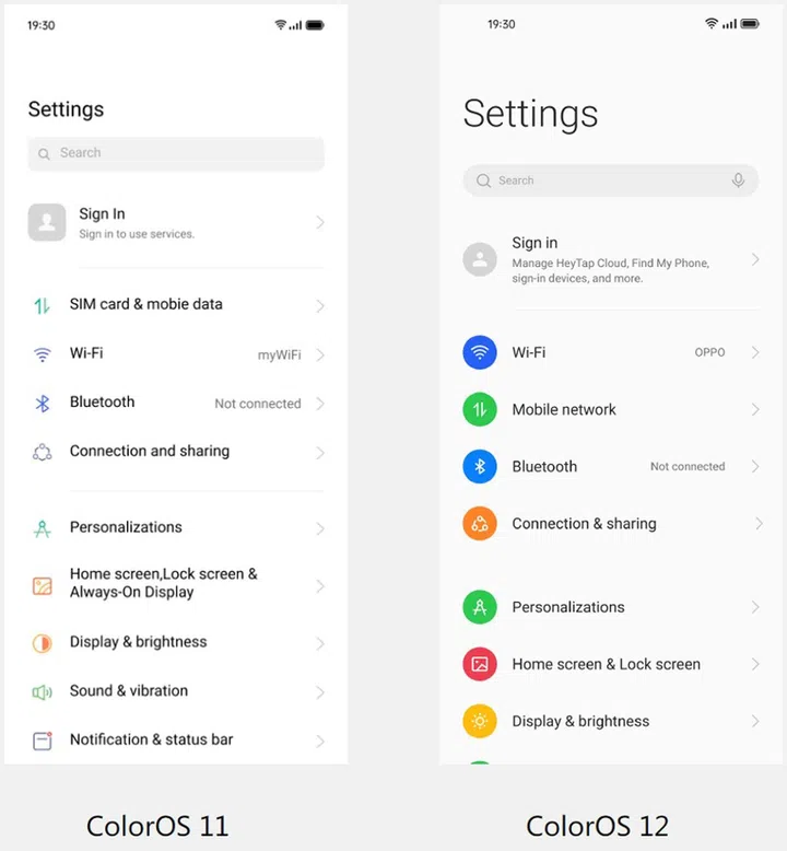 ColorOS 12 saw increased spacing for its UI elements, making it less information-dense than previous iterations.