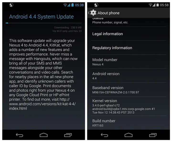 To check whether the update is available for your Nexus 4, head over to Settings > About Phone > System Updates. If you are interested to find out about the new Android OS, head over to our article on "The Best Features of Android 4.4 KitKat".