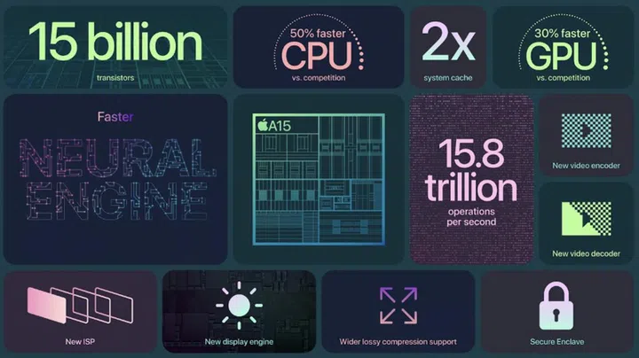 The processor is new. Inside is Apple’s new A15 Bionic which is built on a 5nm process and is a 6-core component with two high-performance cores and four high-efficiency cores. It also has a 4-core GPU. Apple claims A15 Bionic’s CPU is 50% faster than the leading competition, while its GPU is 30% faster than the leading competition. However, it stopped short at identifying who this “leading competition” is.
