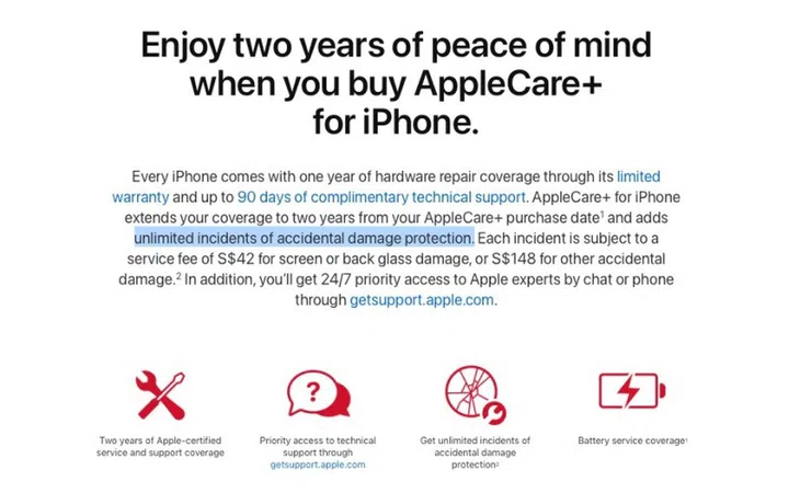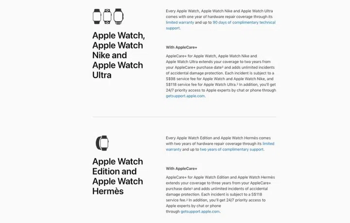 For the iPhone, you have to pay S$42 for each incident of screen or back glass damage, or S$148 for any other accidental damage. For the Apple Watch/Apple Watch Nike, Apple Watch Ultra, Apple Watch Edition and Apple Watch Hermès, each incident of accidental damage will incur a service of S$118.