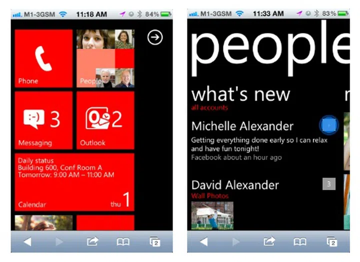 Using HTML5, Microsoft created a demo of its mobile operating system's user interface, which can be loaded on the Mobile Safari browser on iOS and Android's native web browser. Throughout the demo, you have some semblance of free movement when you tap on the various features of the user interface. Further in, the demo guides you to swipe and tap on specific areas to highlight features such as Facebook chat and social media feeds within the People hub.