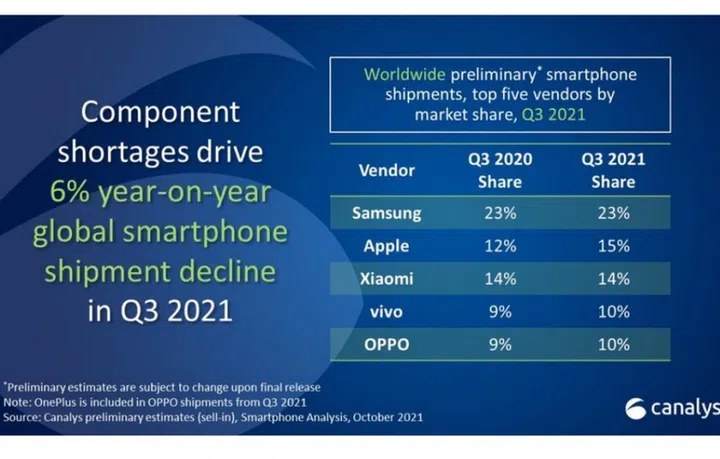 Research firm Canalys shared that the global phone shipments fell 6% in Q3 as phone makers struggled to meet demand amid component shortages. Canalys added that channel inventories of phones are running low and the upcoming sales holidays will widen the gap between demand and supply.