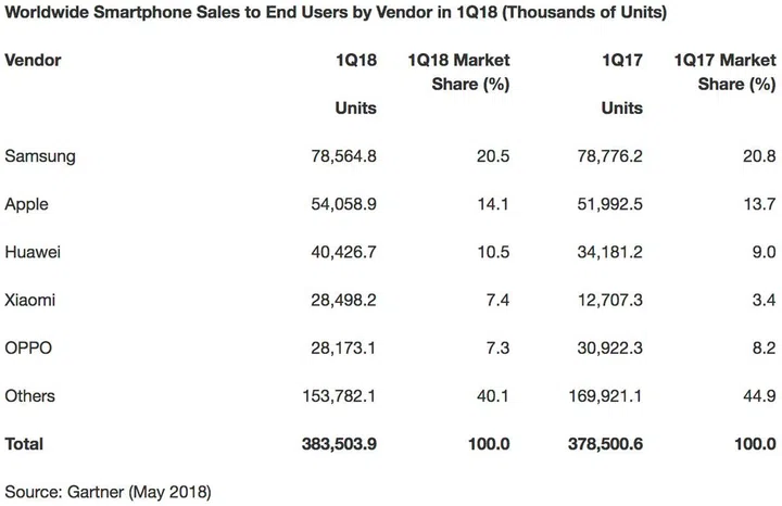 The latest figures from Gartner show a slight increase in global smartphones sales in Q1 2018 compared to the same period last year. This comes after the first decline in smartphone sales for the first time in nine years at the end of last year.