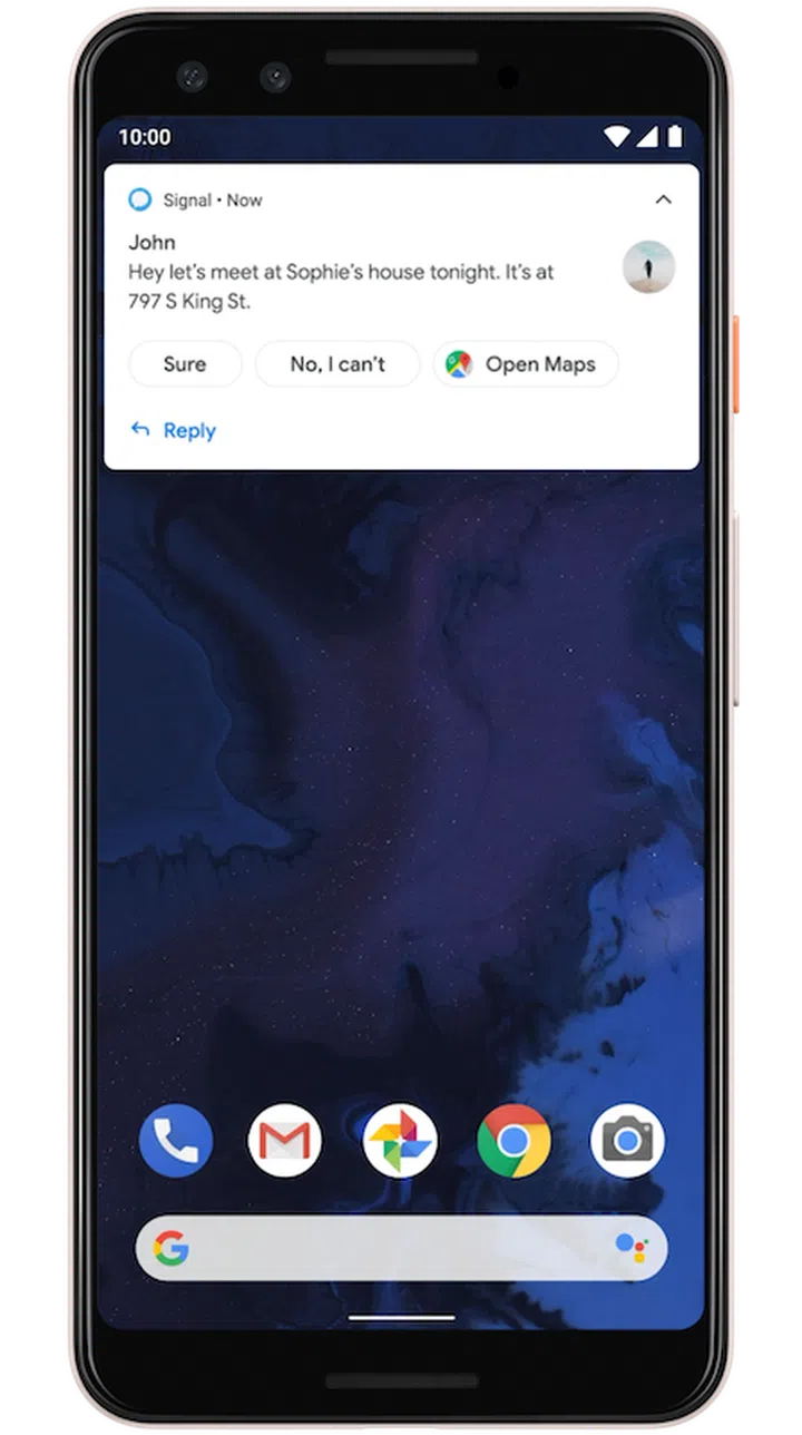 Android Q will use its on-device machine learning capabilities to let any messaging app suggest replies in the notification area. Smart Reply can also suggest actions based on your notifications. It will also suggest the next possible course of action, such as setting a calendar entry or checking where the meetup is, and have all information pre-filled. For example, if someone texts you an address, it'll surface the option to open it in Google Maps.
