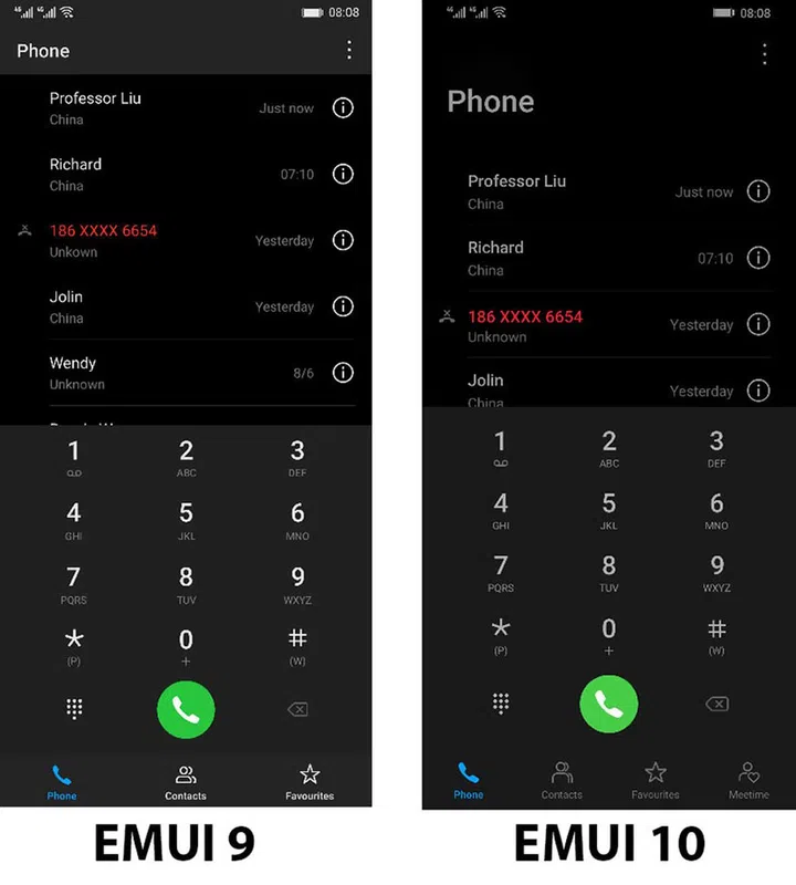 Android Q finally gets full native dark mode support, so technically EMUI 10 doesn't need a dark mode any more. Instead, Huawei chose to tweak the way various elements on the screen are displayed when in dark mode so that the whole screen remains comfortable in any lighting condition. For example, in the Dailer screen, the larger call button's green is more subdued, while the blue on the smaller phone icon is increased. You'll also notice that the brightness of the number pad is reduced as well, and not as glaring.