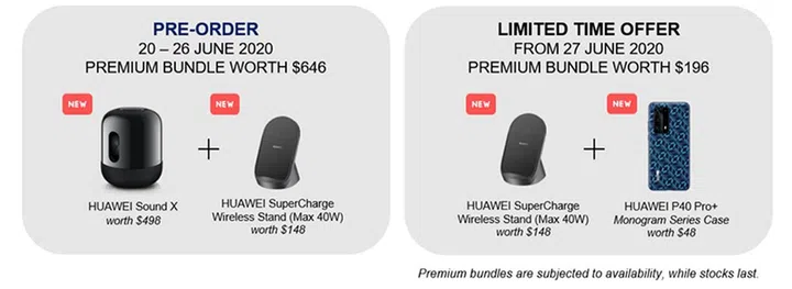 If interested buyers pre-order the Huawei P40 Pro+ between 20 June to 26 June 2020, they can receive a premium bundle consisting of the Huawei Sound X wireless home speaker (worth S$498) and the Huawei 40W SuperCharge Wireless docking stand (worth S$148) while stocks last. If buyers purchase the phone on 27 June 2020 onwards, they are entitled to receive the Huawei 40W SuperCharge Wireless docking stand and a protective phone cover (worth S$48) while stocks last.