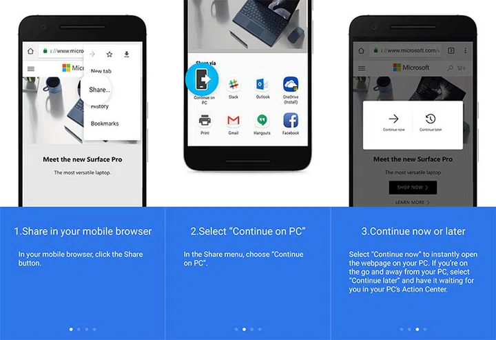 When all that is done, you can start reading a webpage on your phone and select the “Continue on PC” option in the Share pane to bring up two more options: “Continue now” and “Continue later”. The former will open up the webpage in the Edge browser on the linked PC; the latter will file the link to the Action Center so that you can open the page at a later time. Link sharing is just one of several cross-device scenarios Microsoft is working on; more capabilities like cross-device copy and paste is expected to be added down the road.