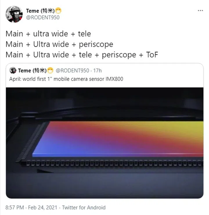 A follow-up Tweet by the tipster also said that he assumed "they" will continue using 50MP lenses with RYYB filters for the 1-inch sensor. Well, there's really only one company that has RYYB filters for its rear phone cameras, so the mystery's gone at this point.