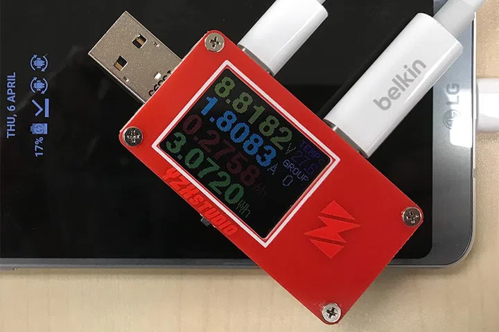 I happened to have an Apple 87W USB-C power adapter for the new MacBook Pros, which is a USB-PD charger that can do 20.2V/4.3A and 9V/3A, so I decided to do a quick test. With the G6’s battery drained down to around 10%, the Apple charger was measured to be topping up the G6’s charge at around 8.8V at 1.8A.