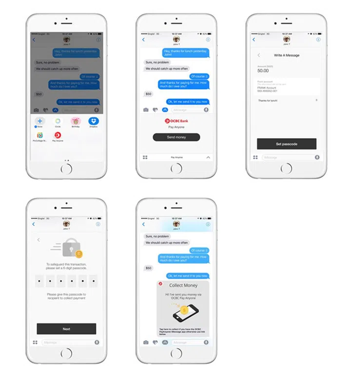 To send money using Siri, you just need to tell Siri to pay the person in your contact list and how much, like “Pay Chu Kang $50.” Once the contact and payment details are confirmed, you’ll be guided to complete the transfer using OCBC Pay Anyone. You can also send money via iMessage through text without leaving the chat. Within the iMessage screen, users can launch the OCBC Pay Anyone iMessage app to start the transfer.