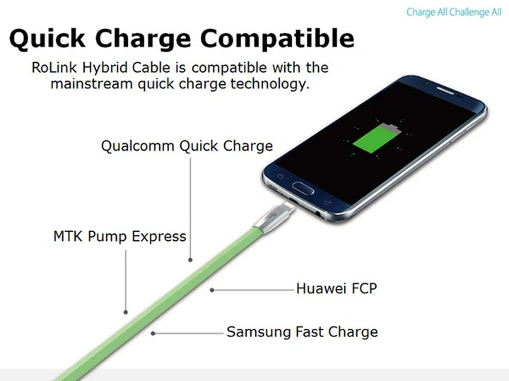 As a versatile cable, it supports iOS devices with a 2.1A output, while being capable of supporting mainstream quick-charging technology. Technologies listed include Qualcomm quick Charge, MTK Pump Express, Huawei FCP, and Samsung Fast Charge. As such, the RoLink Hybrid Cable is compatible with iPhone 5 or later, iPad 4 or later (but not the iPad Pro), iPad Nano, iPod Touch. Smartphones and tablets from Samsung, Huawei, Xiaomi, Meizu, and ZTE work just as well too, going by their specification sheet.