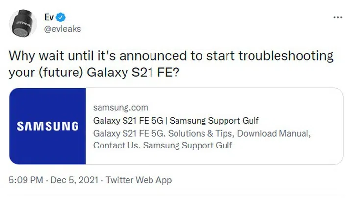 Samsung’s official UAE website accidentally uploaded the Galaxy S21 FE’s user manual. Unfortunately, the phone tipster caught it and uploaded the URL to his Twitter feed before it was quickly taken down.