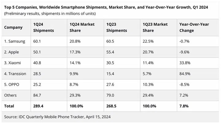 However, the situation is not all that rosy for Samsung. Compared to the same period in 2023, Samsung actually shipped 0.7% fewer phones. The same could be said for Apple – it saw a drop of 9.6% in iPhone shipments compared to Q1 2023.