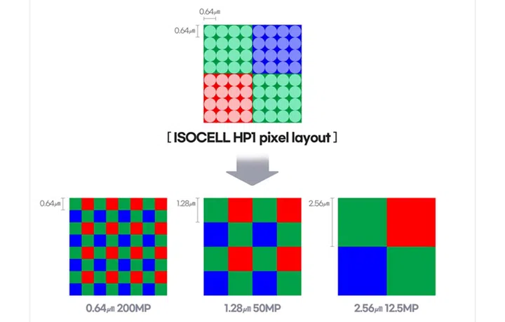 ISOCELL HP1 can go up to 2.56μm (by merging pixel data from 16 neighbouring pixels) if needed. Conventional pixel-binning techniques for phone image sensors are fixed to a single layout and typically do not swap between layouts.