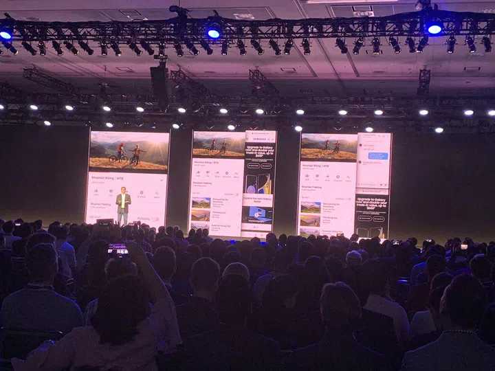 As for what the rest of the device looks like, unfortunately Samsung dimmed the lights to protect the design elements of the phone but Denison did tease, “There’s a device inside here, and it is stunning.”