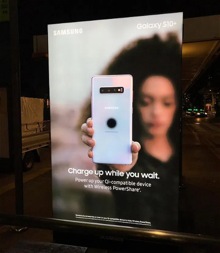 Spotted at 10 bus stands - Samsung Galaxy S10 wants to wirelessly charge your Qi-compatible phone to demonstrate their Wireless PowerShare feature.
