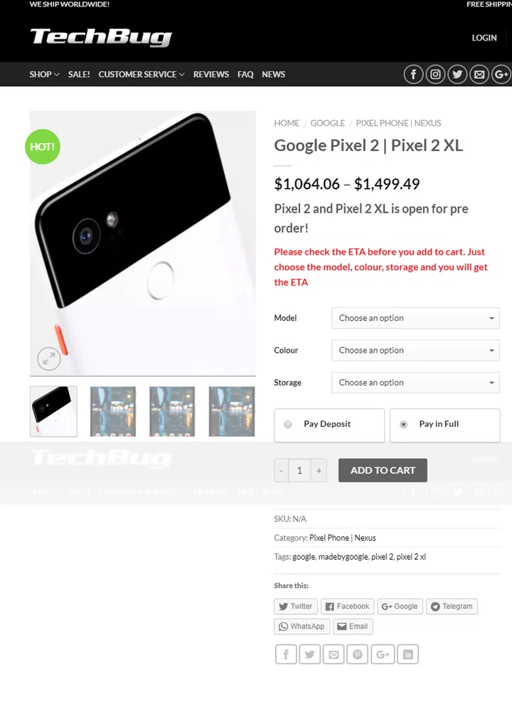 Malaysian portal TechBug offers worldwide shipping, which is excellent for our little red dot down in the South. The retailer’s site accepts pre-orders for Pixel 2 and Pixel 2 XL, in almost all color variants (Pixel 2’s Kinda Blue isn’t listed) and both storage sizes (64GB or 128GB). The phones have 1-year limited warranty by Google, and it only covers manufacturing defects. TechBug stated that buyers should contact them for any issues with the device.